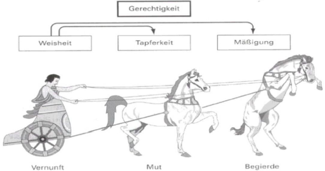 Der Wagenlenker (Verstand, Logos, Vernunft) sollte grundsätzlich die Kontrolle haben. Er braucht aber, wenn der Wagen nicht nur sicher, sondern auch schnell vorankommen soll, starke Pferde. Ein wildes (Eros, Begehrungsvermögen), das nur so vor Lebensenergie strotzt, und eines das dem Wagenlenker eher hilft, den Kurs zu halten (Thymos), das wilde wieder auf Linie zu bringen, wenn es auszubrechen droht. Natürlich muss es ein guter Wagenlenker sein, wenn es insgesamt ein gutes Gespann sein soll. Er muss also den Überblick haben und sich auskennen. Wenn er selbst keine Ahnung hat, wo es langgeht (aktuelle Führung des Staates), dann stimmt womöglich die Richtung gar nicht. Und er muss seinen Pferden Freiräume lassen, sie einfach auch mal laufen und sich austoben lassen. Doch zurück zu den Tugenden.