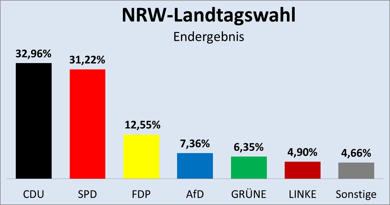 Eine gute Prognose sollte bei den beiden großen Parteien nicht mehr als 2 bis 3 Prozent neben dem tatsächlichen Wahlergebnis liegen. Bei den kleineren Parteien sollte die Abweichung nicht mehr als 1 bis 2 Prozent betragen. Insgesamt sollte die mittlere Abweichung unter 2 Prozent liegen, besser unter 1,5, im Idealfall unter 1 Prozent. Vergleichen wir nun die Wahl-O-Matrix-Prognose vom 13.05. (Grafik unten), siehe dazu meinen Artikel So wird die NRW-Wahl ausgehen, mit dem Wahlergebnis der NRW-Wahl (Grafik oben), welches am 15.05.2017 feststand.