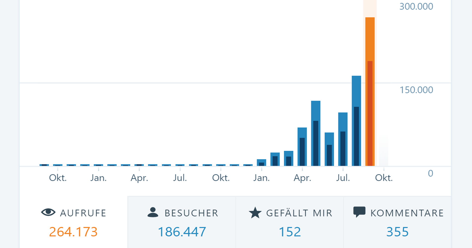 Das sensationelle Wachstum von juergenfritz.com geht weiter. Im August wurde erst ein neuer Rekord erzielt mit fast 160.000 Seitenaufrufen. Doch die Anzahl der Leser/Seitenaufrufe hat sich im September um nochmals mehr als 100.000 gesteigert auf jetzt über 264.000.