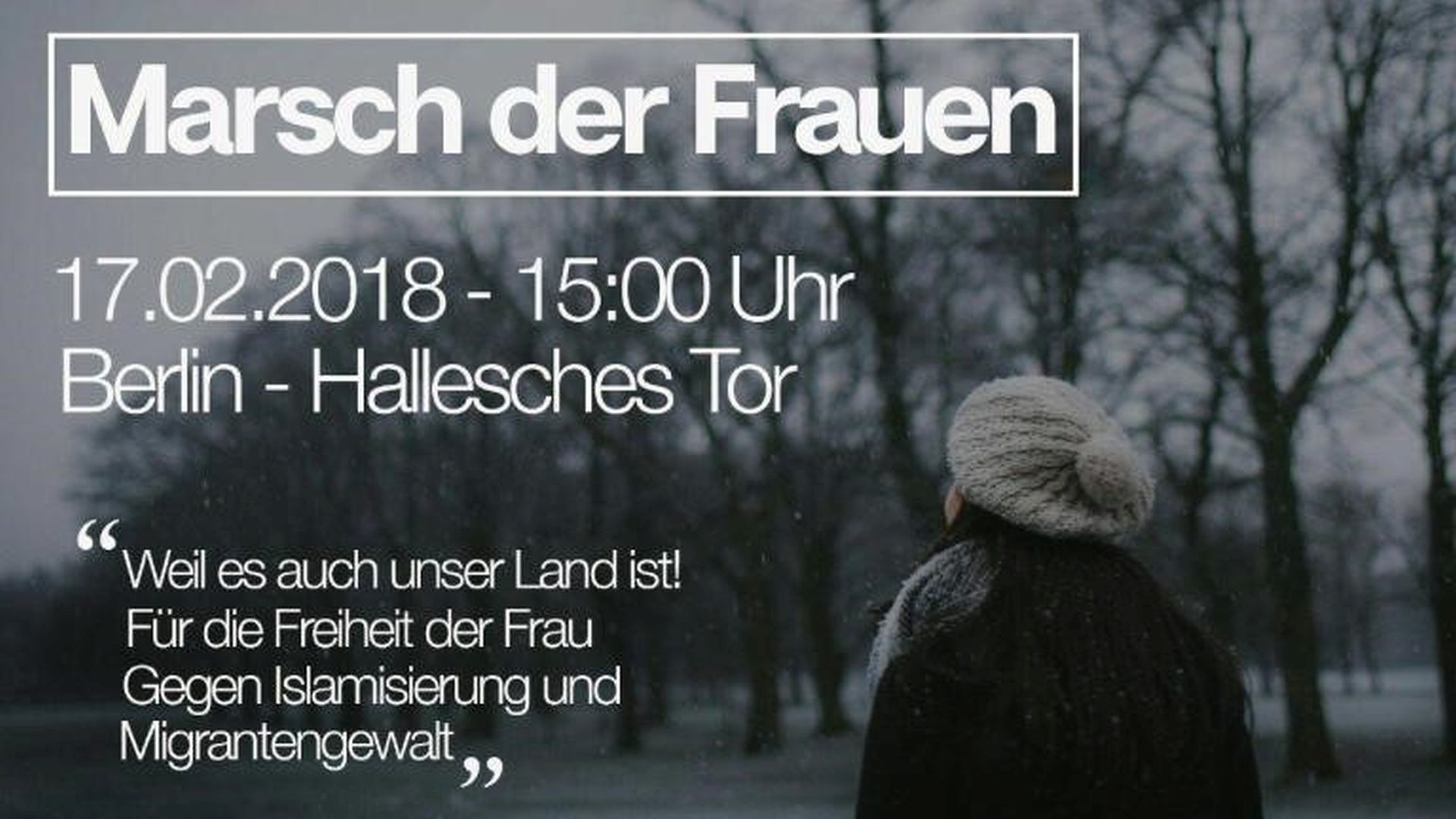 Am Samstag, den 17.02.2018, wird um 15 Uhr eine Demonstration vom Halleschen Tor in Berlin-Kreuzberg bis nach Berlin-Mitte vors Kanzleramt führen. Sie ist angelegt als Protest gegen die Welle brutaler Gewalt gegen Frauen im öffentlichen Raum, die als unmittelbare Folge der unkontrollierten Einwanderung von Millionen zumeist muslimischen Männern angesehen wird. De facto ist es ein Protest gegen den allgemeinen Status Quo, von dem die Migrationspolitik ein wesentlicher Teil ist. Eine Teilnehmerin ruft uns zu: Kommen Sie nach Berlin zu diesem wichtigen Marsch der Frauen, damit wir diesen Wahnsinn endlich stoppen!