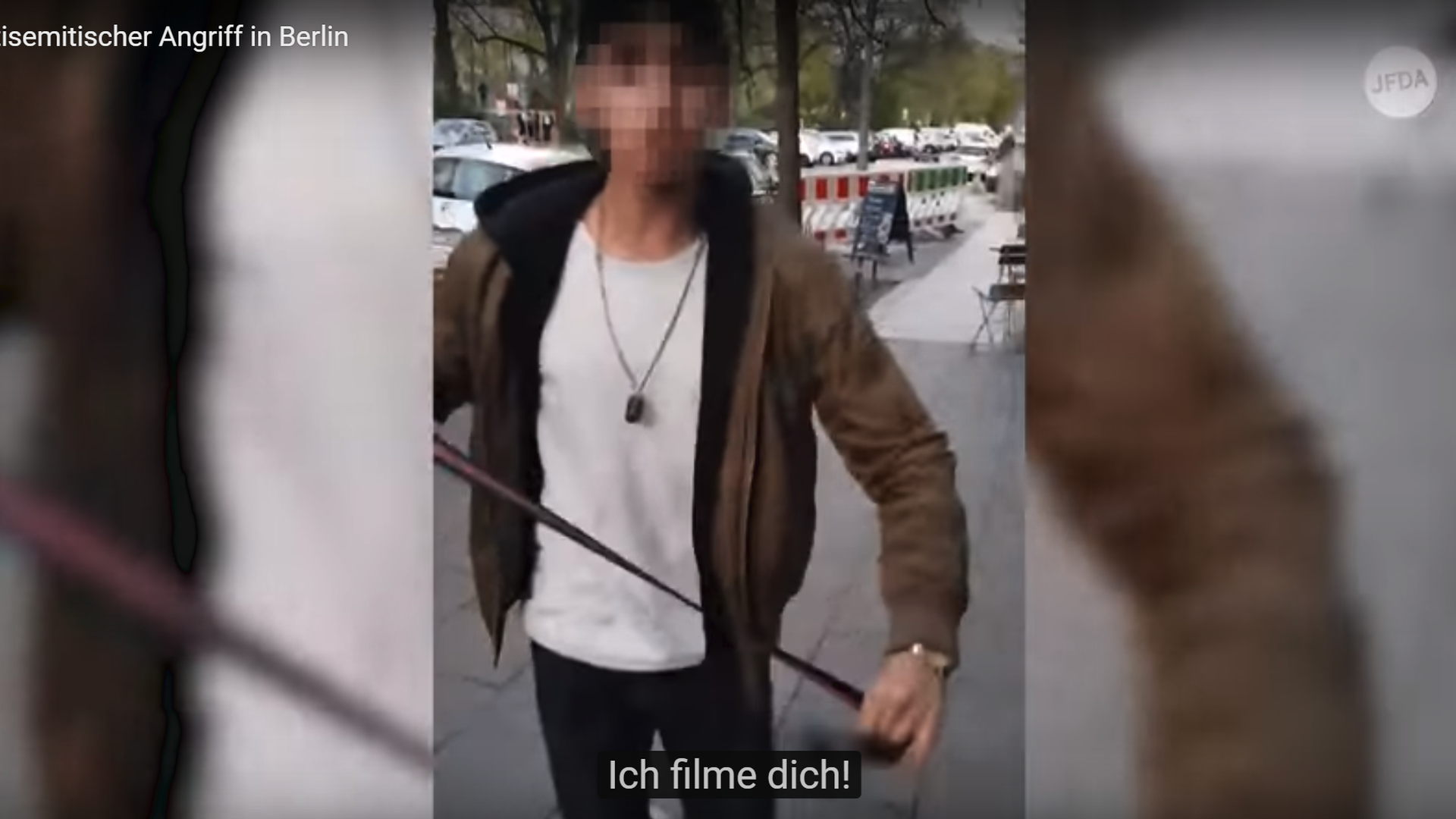 „Ein Video zeigt, wie ein junger Mann sich darüber aufregt, dass er gefilmt wird und mit einem Gürtel nach dem Filmenden schlägt. Dabei ruft der Täter mehrmals „Yahudi“, was auf Arabisch Jude bedeutet. Das Video zeigt nur einen Ausschnitt der Konfrontation, was genau sich vor den Schlägen abspielte, ist unklar.“