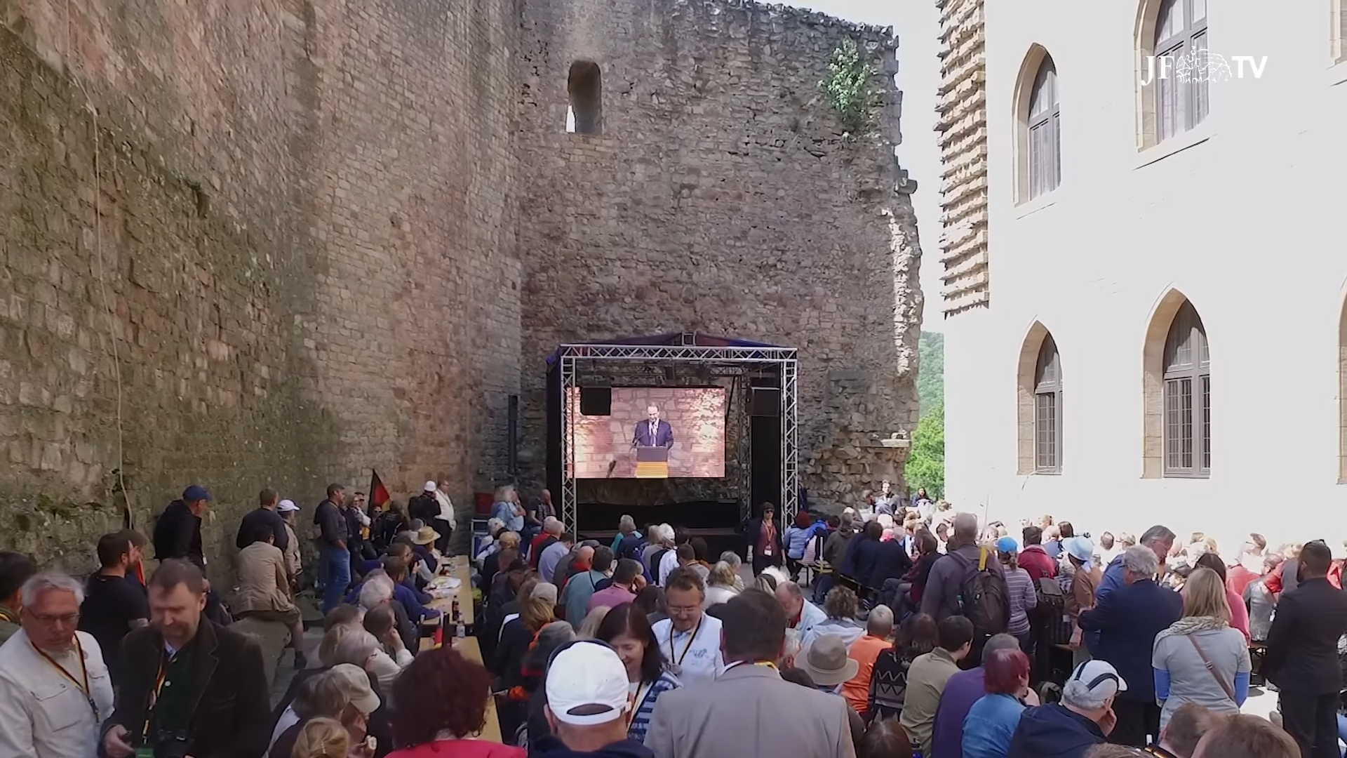 Am Samstag, fast 200 Jahre später, versammelten sich erneut patriotische Bürger an diesem historischen Ort. Auf Einladung des Ökonomen Max Otte begingen sie das Neue Hambacher Fest. Wie damals begann es mit einem Fußmarsch zum Schloß, begleitet natürlich wieder von Störaktionen linker Gegner. Eine große Ladung Buttersäure war auf den Weg zum Schloß hingekippt worden, die wie Gülle roch. Die üblichen dümmlichen Parolen waren auf die Straße geschmiert. Oben standen dann 60 bis 80 linke Chaoten und versuchten, die Veranstaltung mit Sprechchören zu stören.
