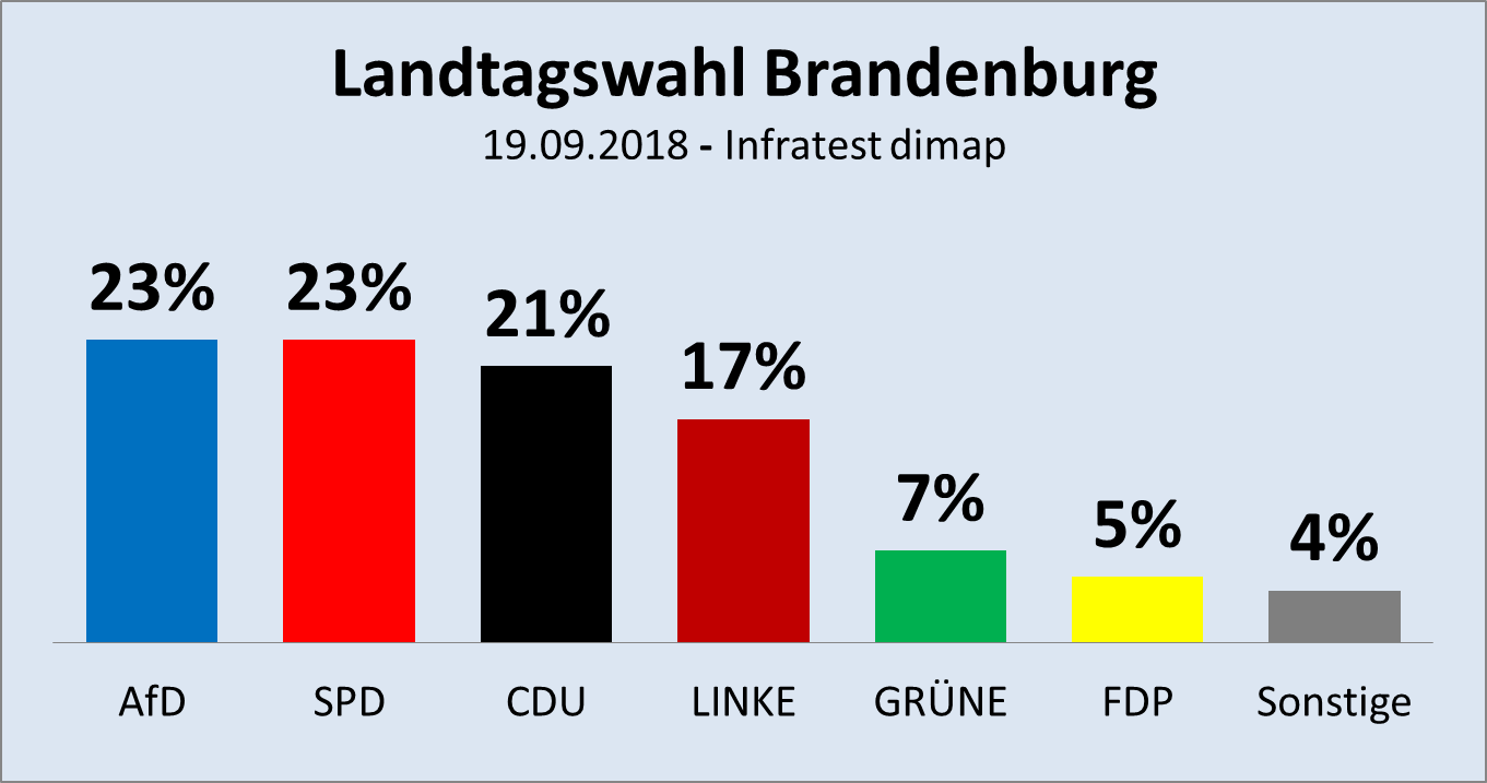 Fast 20 Prozentpunkte lag die SPD bei der letzten Landtagswahl in Brandenburg vor der AfD. Die CDU hatte beinahe 11 Punkte Vorsprung und Die Linke 6,4. Doch das hat sich inzwischen vollkommen geändert. Im nächsten Jahr sind in Brandenburg wieder Landtagswahlen und die werden völlig andere Ergebnisse zeitigen, wie sich jetzt schon ablesen lässt. In der aktuellen Umfrage von Infratest dimap für RBB, Antenne Brandenburg hat die AfD sowohl Die Linke als auch die CDU bereits überholt und liegt mit der SPD gleichauf auf Platz eins.