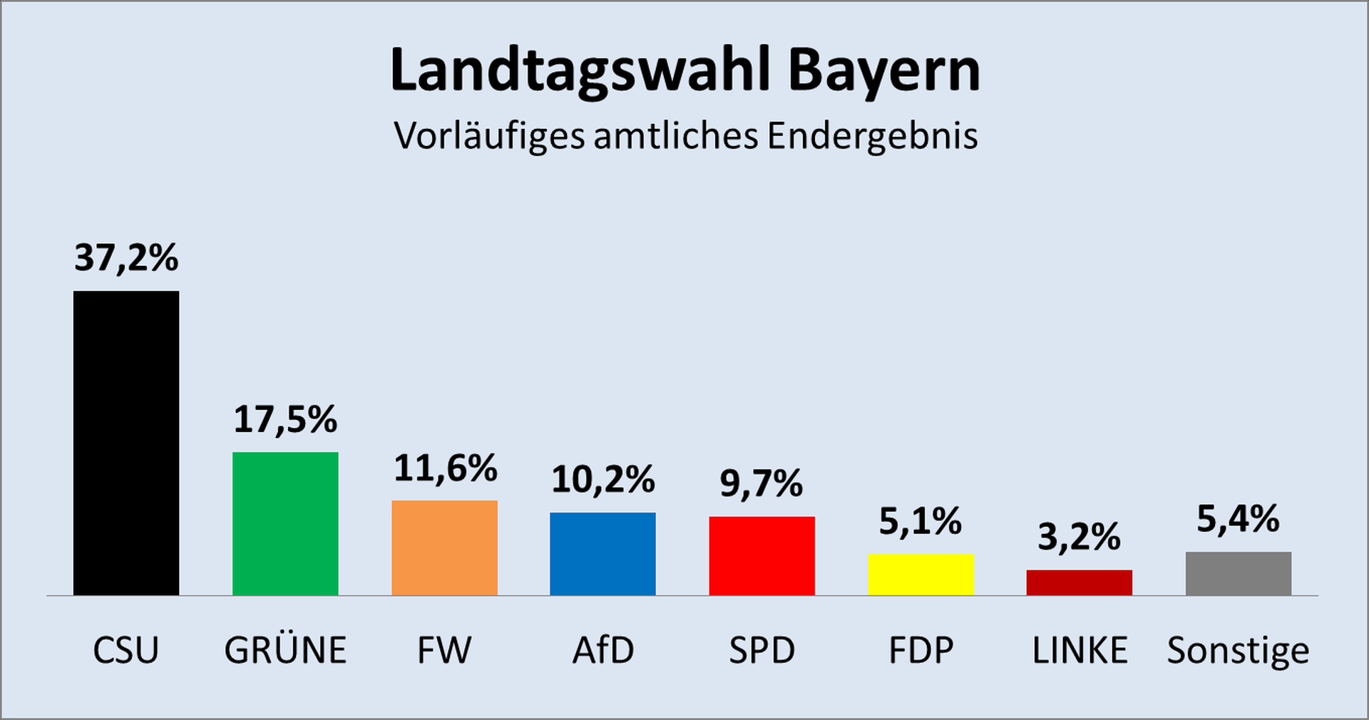 Die Würfel sind gefallen, Bayern hat gewählt. Hier das vorläufige amtliche Endergebnis sowie eine erste Analyse. Die CSU schwächelt enorm, fällt aber nicht um. Wir sehen sehr starke Grüne und starke Freie Wähler sowie eine lediglich passable AfD. Der ganz große Verlierer dieses Volksvotums ist aber einmal mehr die SPD, welche die hohen Gewinne der Grünen mit ihren gigantischen Verlusten noch übertrumpft und den linksextremistischen Block (Grüne, SPD, SED) damit insgesamt sogar noch schwächer macht als vor fünf Jahren.