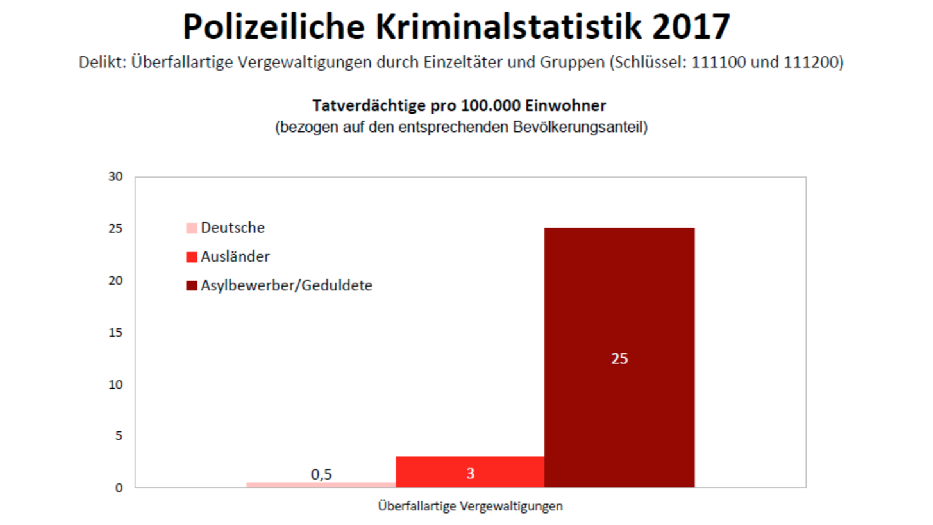 Ergebnis: Bei überfallartigen Einzel- oder Gruppenvergewaltigungen waren Asylbewerber und Geduldete exakt 50 Mal (5.000 Prozent) so kriminell wie Deutsche.