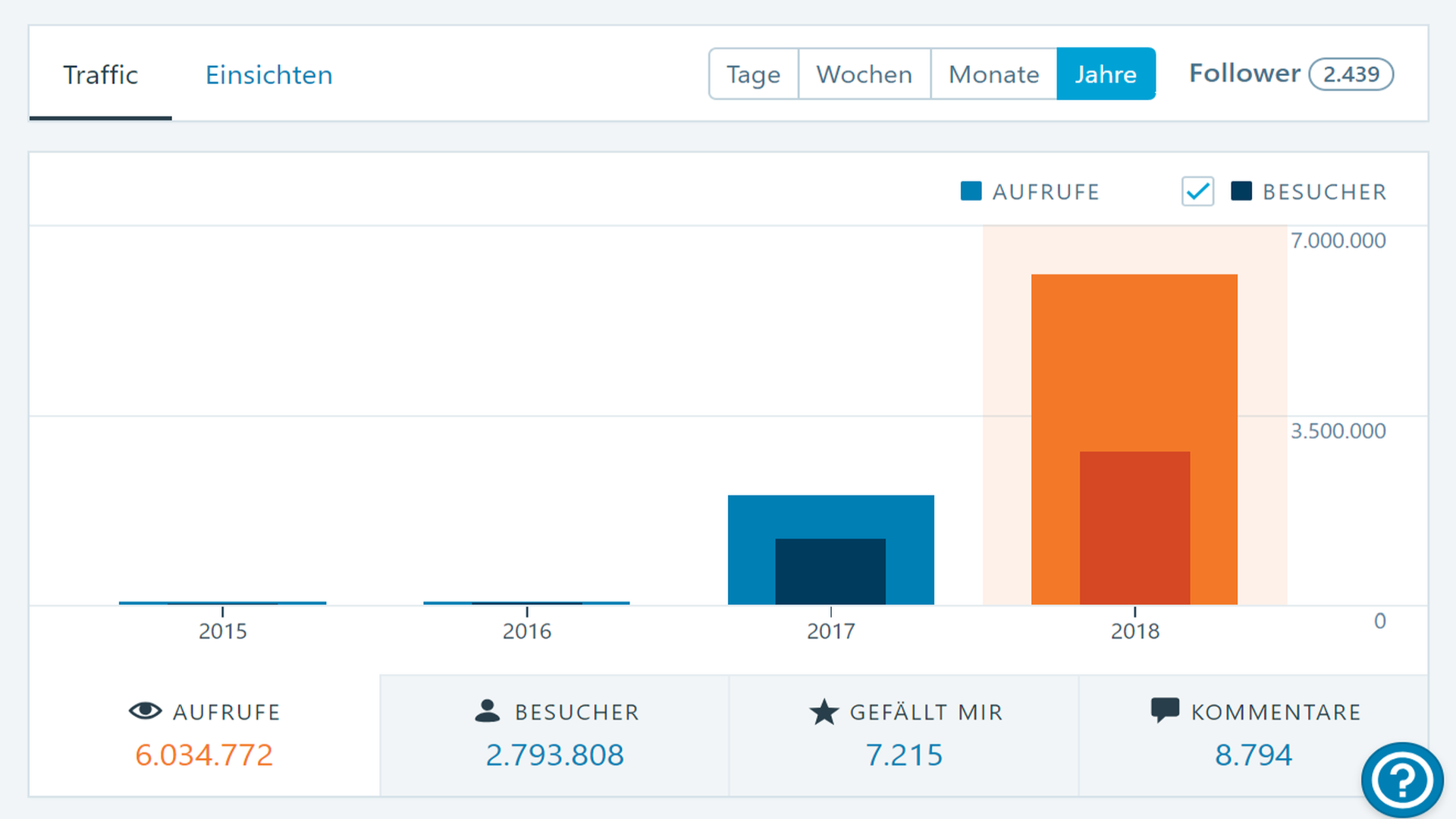 Seit gut zwei Monaten hat Jürgen Fritz Blog ein eigenes Website-Icon (JFB) und die Zahl der Seitenaufrufe hat schon jetzt in den ersten zehn Monaten 2018 das Ergebnis von 2017 (1,99 Millionen) mehr als verdreifacht auf über 6 Millionen zum Stand 31.10.2018. Das heißt, JFB wird inzwischen mehr als 603.000 mal im Monat aufgerufen, also 20.000-fach pro Tag und erreicht täglich etwa 10.000 Leser. Das Schönste aber von allem: Die Anzahl der Blog-Follower (Stammleser), die sich über jeden neuen Artikel informieren lassen, stieg auf über 2.400. Das ist mehr als manch andere Seite hat, die mehrere Millionen Seitenaufrufe im Monat generiert.