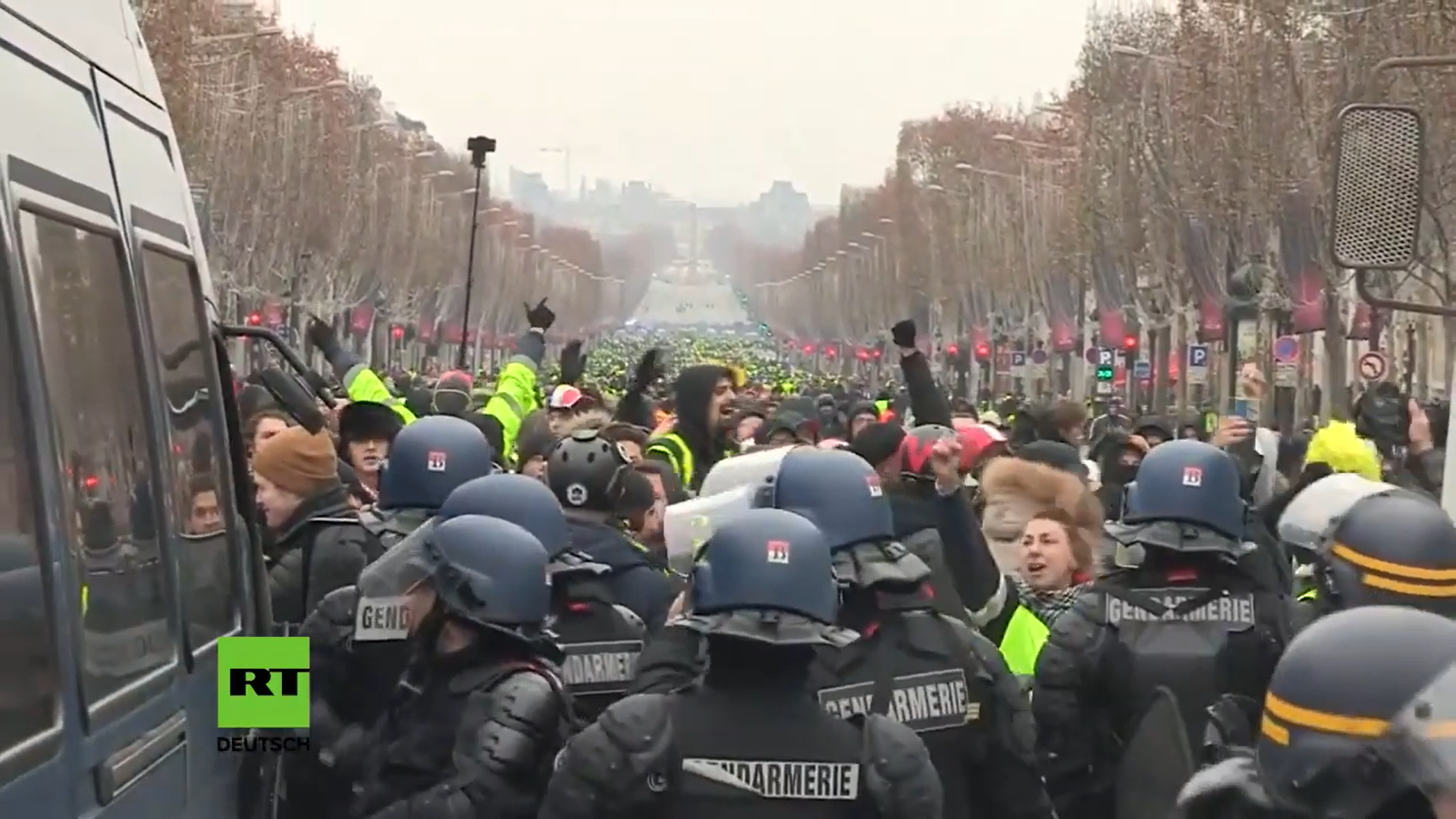 Am gestrigen Samstag kam es in Paris und an verschiedenen anderen Orten erneut zu Kundgebungen der Gelbwesten. Vor allem auf den Champs-Élysées kam es wieder zu Spannungen zwischen Sicherheitskräften und Demonstranten. Dabei wurden auch am fünften Wochenende Tränengas und Wasserwerfer eingesetzt. Allein in Frankreichs Hauptstadt kamen rund 8.000 Polizisten und andere Ordnungskräfte mit 14 gepanzerten Fahrzeugen der Gendarmerie zum Einsatz. Landesweit wurden 69.000 Polizeikräfte mobilisiert. Sehen Sie hier Originalaufnahmen aus Paris.