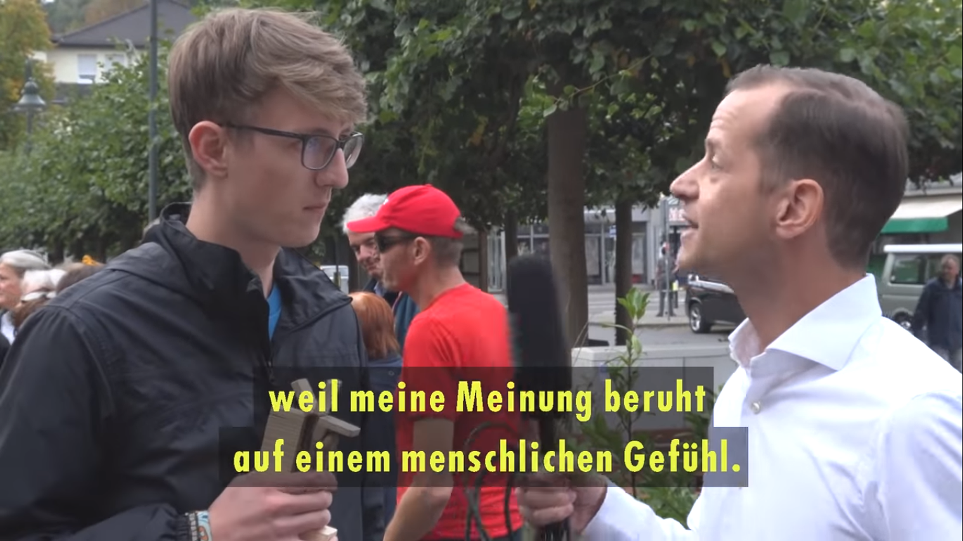 Hier ist das Ganze noch schöner zu sehen. Der Rechtsanwalt und NRW-Landtagsabgeordnete Roger Beckamp (AfD) sprach im September 2018 mit einem jungen Mann, den man wohl als eine Paradebeispiel eines grün-linken Gutmenschen bezeichnen könnte, also einem Naivling und Heuchler vor dem Herrn, der sich, wenn man ihn nur drei, vier, fünf Minuten sprechen lässt, in völlige Widersprüche verstrickt, der nur antrainierte Phrasen abspulen, aber nicht einen einzigen eigenständigen Gedanken entwickeln kann, ja der nicht einmal fähig ist, überhaupt zu verstehen, was er eigentlich redet. Im Grunde kein selbstständiges Subjekt, sondern lediglich ein trauriges marionettenhaftes Exemplar des Zeitgeistes.