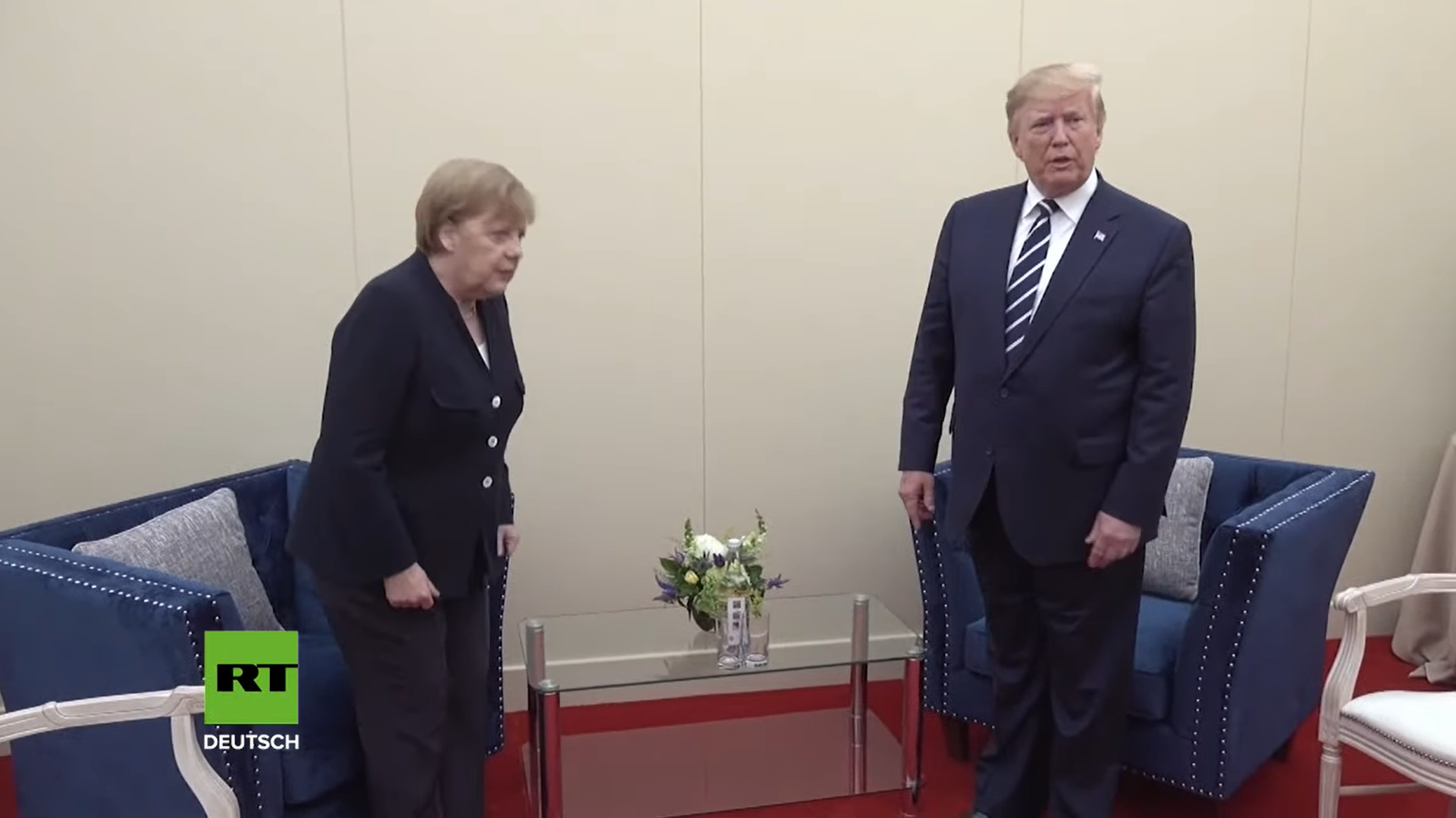 Die deutsche Regierungschefin, Angela I., die ewige Kanzlerin, läuft ganz verloren durch den Raum, weiß nicht so recht wohin, ist sichtlich verunsichert. Hinter ihr der Präsident der Vereinigten Staaten von Amerika, der völlige Ruhe und Souveränität ausstrahlt, sie keines Blickes würdigt. Das ist die Ewige nicht gewohnt. Sie wird immer unsicherer. Jetzt steht sie vor einem Sessel, weiß nicht wohin mit sich. Soll sie sich setzen oder stehen bleiben? Sie senkt sich schon ein wenig, sieht dann aber zu ihm rüber, der aufrecht und voller Selbstsicherheit dasteht. Also bleibt sie auch stehen, macht nun noch mehr verunsichert einen Schritt nach vorne. Schaut wieder zu ihm, er aber nicht zu ihr. Sie bekommt keinen Blick. Nicht einen einzigen. Ihre Unsicherheit steigert sich immer weiter. So wurde sie noch niemals vorgeführt. Und das vor aller Welt.