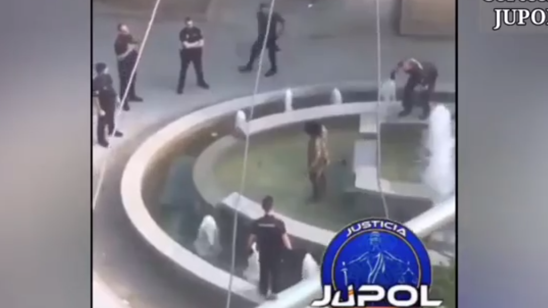 In dem von der Polizeigewerkschaft Jupol geteilten Video können Sie sehen, wie die Polizei den Mann umzingelt, bis einer von ihnen den Machetenmann nach einem spektakulären Sprung von hinten überrascht und dieser so überwältigt werden kann.
