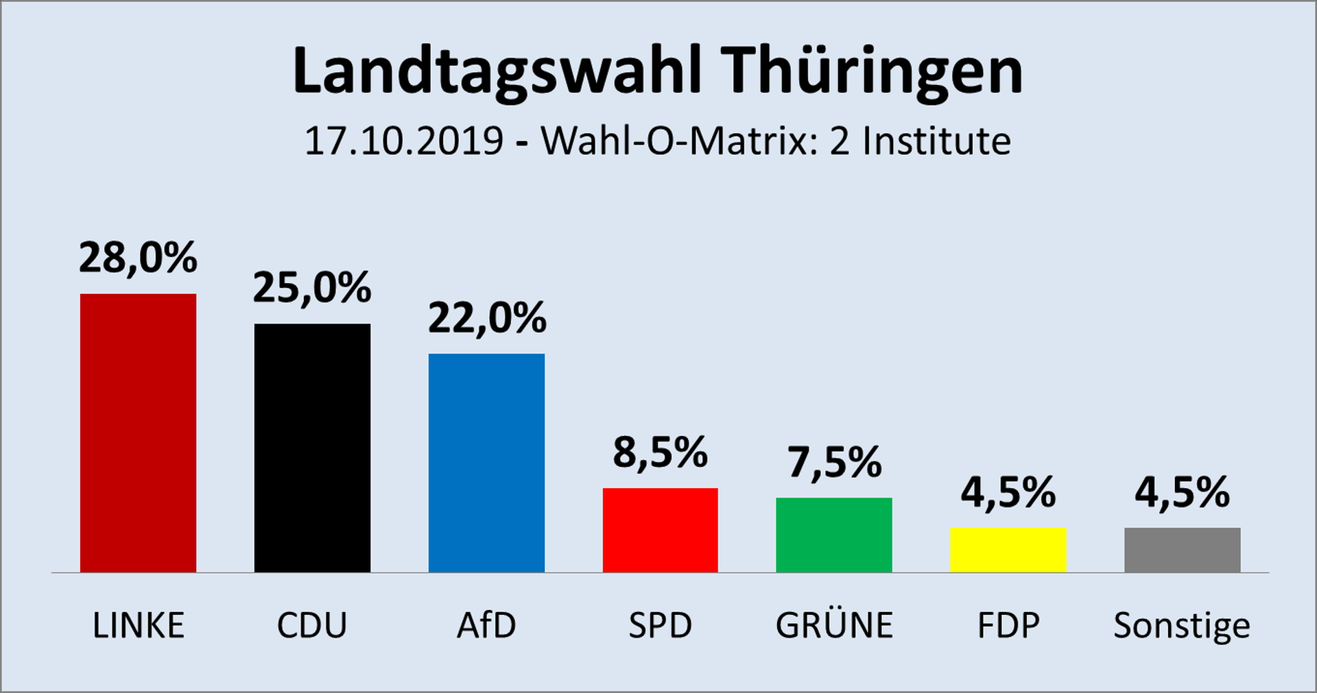 Gestern veröffentliche sowohl das ZDF eine aktuelle Umfrage von Forschungsgruppe Wahlen als auch die ARD von Infratest dimap. Telefonisch befragt wurden vom 14.10. (Mo.) bis 16.10.2019 (Mi.) jeweils mehr als tausend zufällig ausgewählte in Thüringen Wahlberechtigte, wem sie ihre Stimme geben würden, wenn jetzt schon Landtagswahlen wären. Dies ist also keine Prognose für den 27.10.2019, sondern eine Momentaufnahme für diese Woche. Dabei waren die Befragungen repräsentativ für die dort wahlberechtigte Bevölkerung.