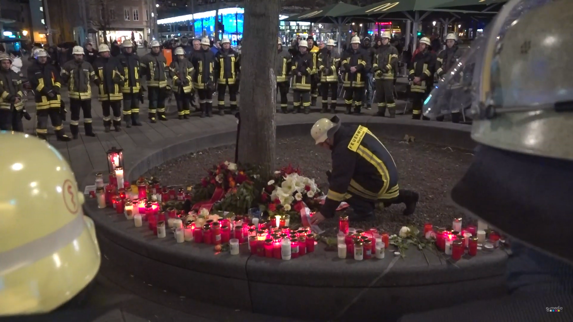 Am Sonntagvormittag versammelten sich am Königsplatz mehr als 100 Beamte der Berufsfeuerwehr, Pensionisten und die Kommandanten der Freiwilligen Feuerwehren, um ihres getöteten 49-jährigen Kollegen zu gedenken. „Es herrscht tiefe Bestürzung und Fassungslosigkeit in unseren Reihen“, beschreibt Feuerwehrchef Andreas Graber gegenüber der Augsburger Allgemeine die Stimmung. Viele Feuerwehrleute hatten während der Andacht, bei der ein Trompetensolo geblasen wurde, Tränen in den Augen. Der tote Kollege war Mitglied der Schicht, die auch am Sonntag im Dienst war.