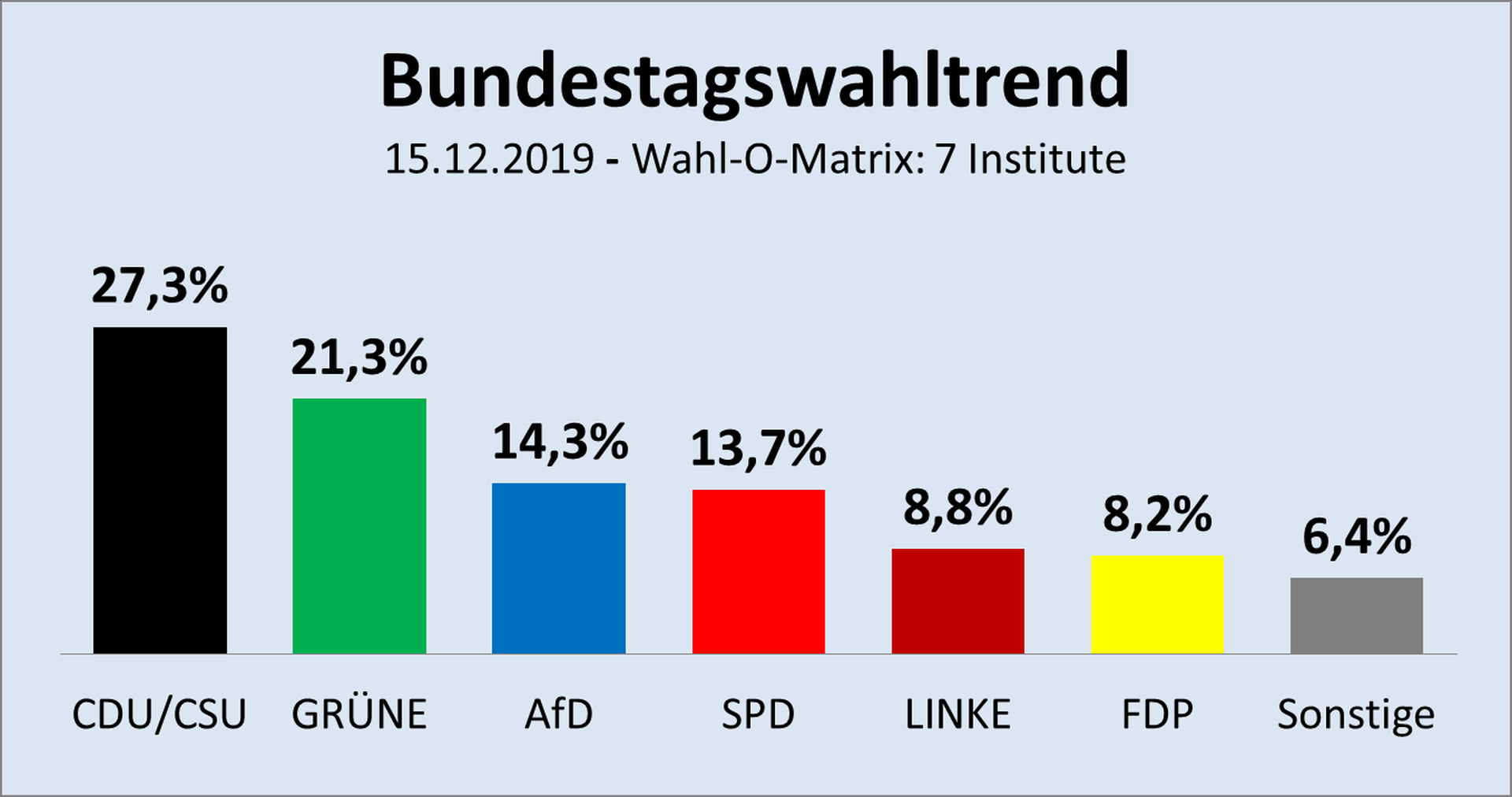 In die Wahl-O-Matrixe-Werte gingen folgende Institute mit ihrer jeweils aktuellsten Erhebung ein: 1. YouGov (mittlerer Erhebungstag: 24.11.2019), 2. GMS (29./30.11.2019), 3. INSA (7./8.12.2019), 4. Emnid (8.12.2019), 5. Infratest dimap (10./11.12.2019), 6. Forschungsgruppe Wahlen (11.12.2019), 7. Forsa (11.12.2019). Angegeben ist bei jeder Partei die Range bei diesen sieben Instituten sowie fettgedruckt der arithmetische Mittelwert: