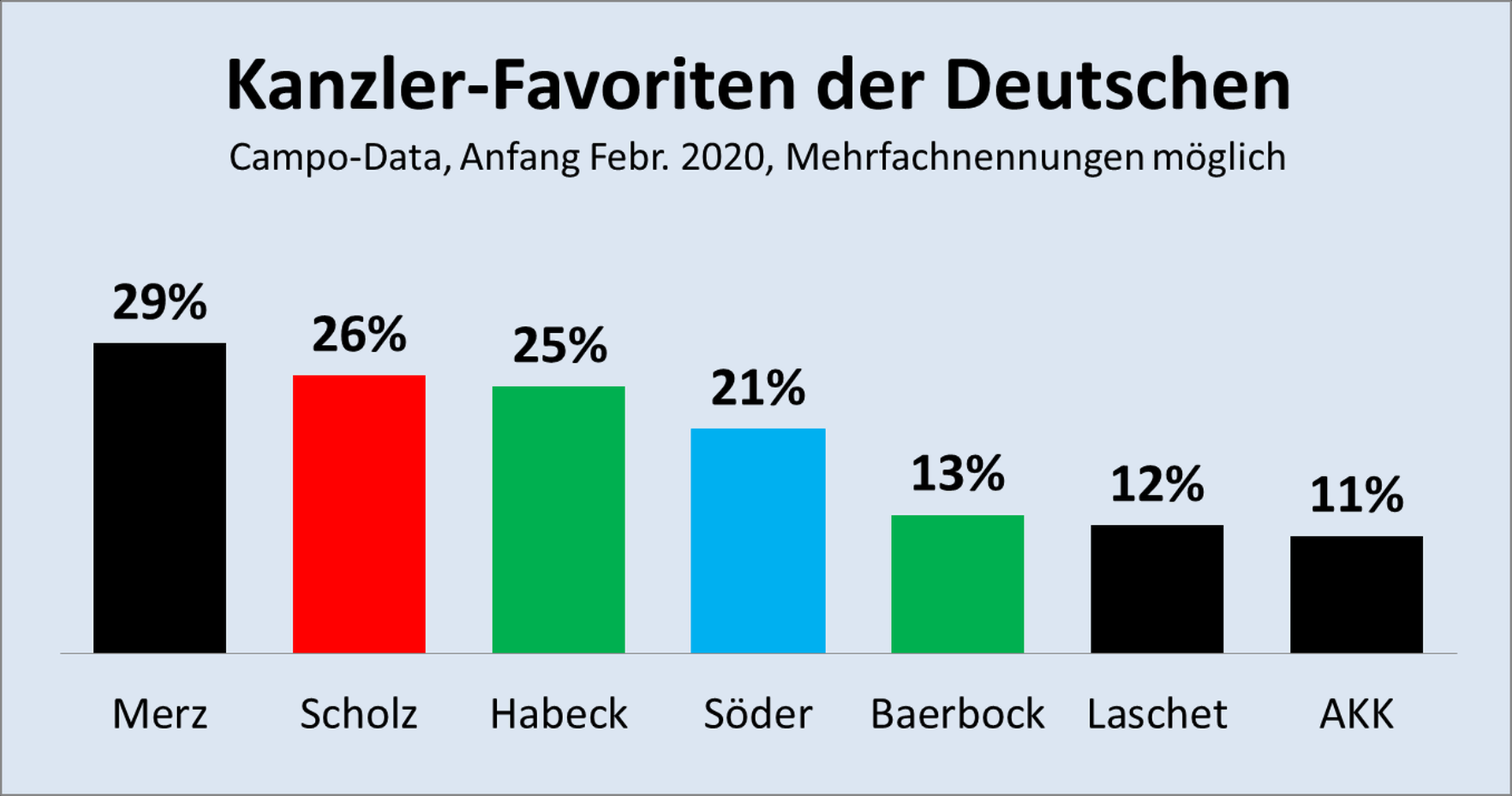 Den Bundeskanzler wählt in Deutschland bekanntlich der Deutsche Bundestag, also nicht das Staatsvolk. Gleichwohl ist es auch für die Parteien natürlich interessant, wen sich die Bürger als Regierungschef wünschen. Das Müncher Marktforschungsinstitut Campo Data, zur WEIMER MEDIA GROUP gehörend, führte dazu – noch vor der Rücktrittsankündigung von AKK – eine Befragung durch. Und so sähe das Ergebnis aus, wenn die Bürger den Kanzler direkt wählen könnten, wobei hier Mehrfachnennungen möglich waren: