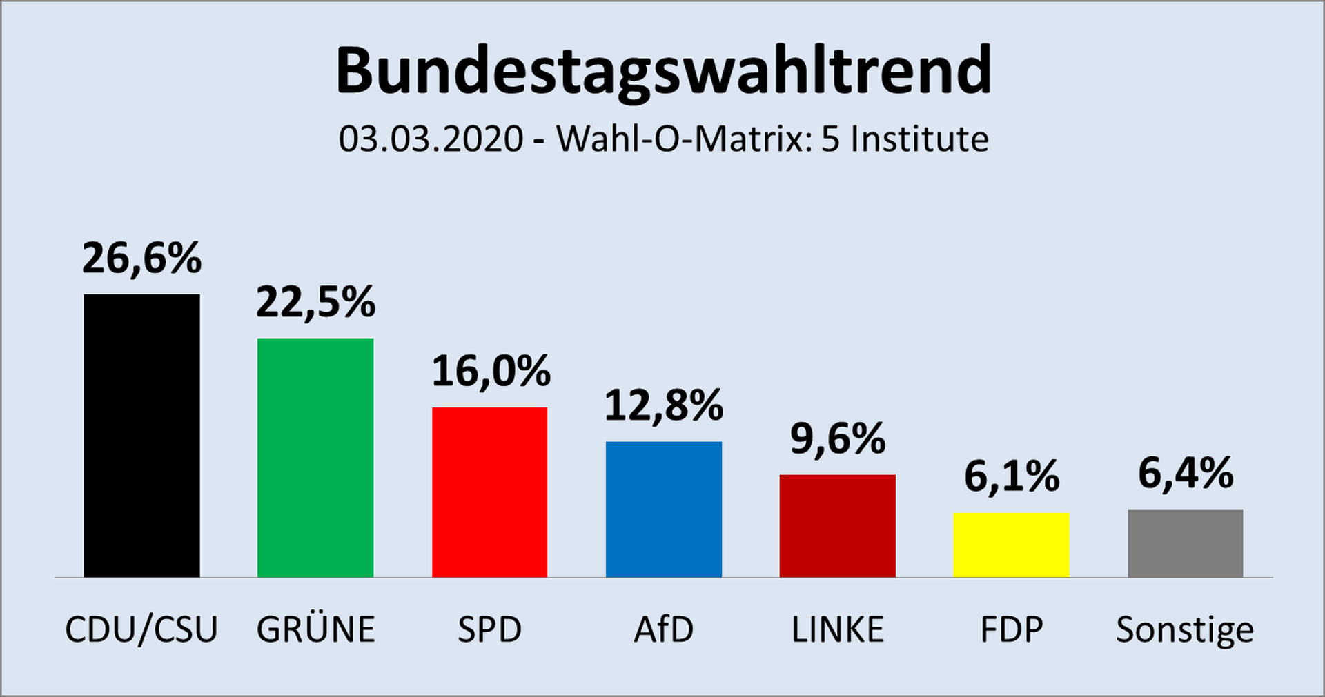 Angegeben ist für jede Partei der Wahl-O-Matrix-Mittelwert aller Institute, die in bezogen auf den mittleren Tag der Befragung in den letzten drei Wochen Erhebungen durchführten. Das waren: a) Infratest dimap, b) INSA, c) Civey, d) Kantar (Emnid), e) Forsa.
