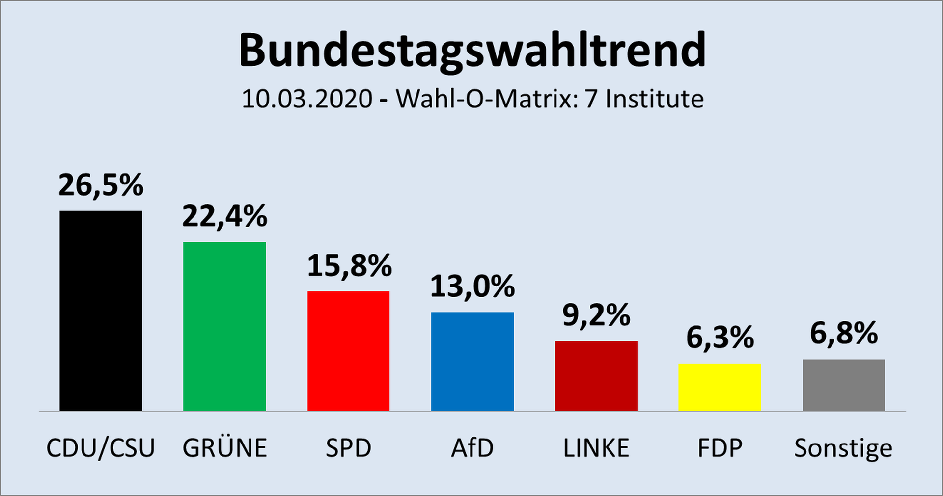 Angegeben ist für jede Partei der Wahl-O-Matrix-Mittelwert aller Institute, die (bezogen auf den mittleren Tag der Befragung) in den letzten drei Wochen Erhebungen durchführten. Das waren: a) Civey (23./24.02.), b) YouGov (29.02./01.03.), c) Kantar / Emnid (01.03.), d) Infratest dimap (03.03.), e) Forschungsgruppe Wahlen (04.03.), f) Forsa (04.03.), g) INSA (07./08.03.):