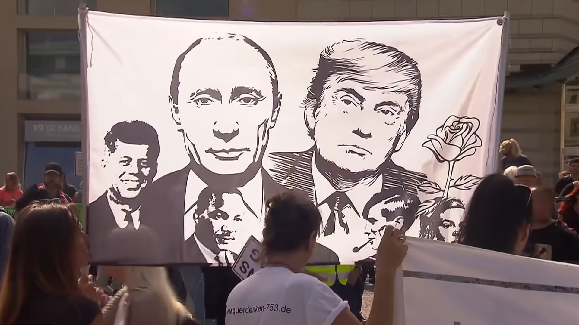 Die US-amerikanische wie die russische Fahne werden mitgetragen, auch werden zwei große Helden gefeiert: Ein düsteres, Grau in Grau gehaltenes Plakat vereint die Gesichter von Wladimir Putin und Donald Trump (siehe Titelbild). Dazu das große Q der geheimnisumwitterten amerikanischen Verschwörungsplattform QAnon. Wie überhaupt Trump ein gerne bemühter Helfer ist. Ein Demonstrant trägt mit seinem Plakat einen Wunsch an den amerikanischen Präsidenten heran, den dieser gewiss nicht erfüllen will: „Mr. President, make Germany great again“.