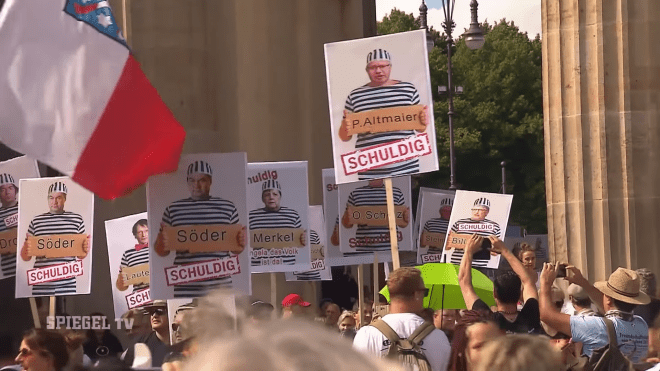 Ein mittelalter, bürgerlich aussehender Mann in Jeans, mit schwarzem Hut hält in der linken Hand ein Plakat, auf dem das achte Gebot in der Lutherschen Übersetzung steht: „Du sollst nicht falsch Zeugnis reden wieder deinen Nächsten.“ Auf dem Plakat in der rechten Hand ist zu lesen: „Gehorsamszeichen wie Hitlergruß, Genossengruß und Alltagsmasken gehören verboten!!!“ Ein anderer trägt als Kopfbedeckung ein Plakat, das eine Parole der Aids-Präventionskampagne variiert: „Gib Gates keine Chance“. An der Siegessäule verkündet ein Demonstrant schriftlich: „Stoppt Chemtrails und Soros“. Andere haben Regenbogenfahnen dabei und wollen nur eins: Frieden.