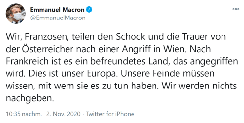 „Ich bin in diesen schrecklichen Stunden, in denen Wien Ziel terroristischer Gewalt geworden ist, in Gedanken bei den Menschen dort und den Sicherheitskräften, die der Gefahr entgegentreten. Wir Deutschen stehen in Anteilnahme und Solidarität an der Seite unserer österreichischen Freunde. Der islamistische Terror ist unser gemeinsamer Feind. Der Kampf gegen diese Mörder und ihre Anstifter ist unser gemeinsamer Kampf.“