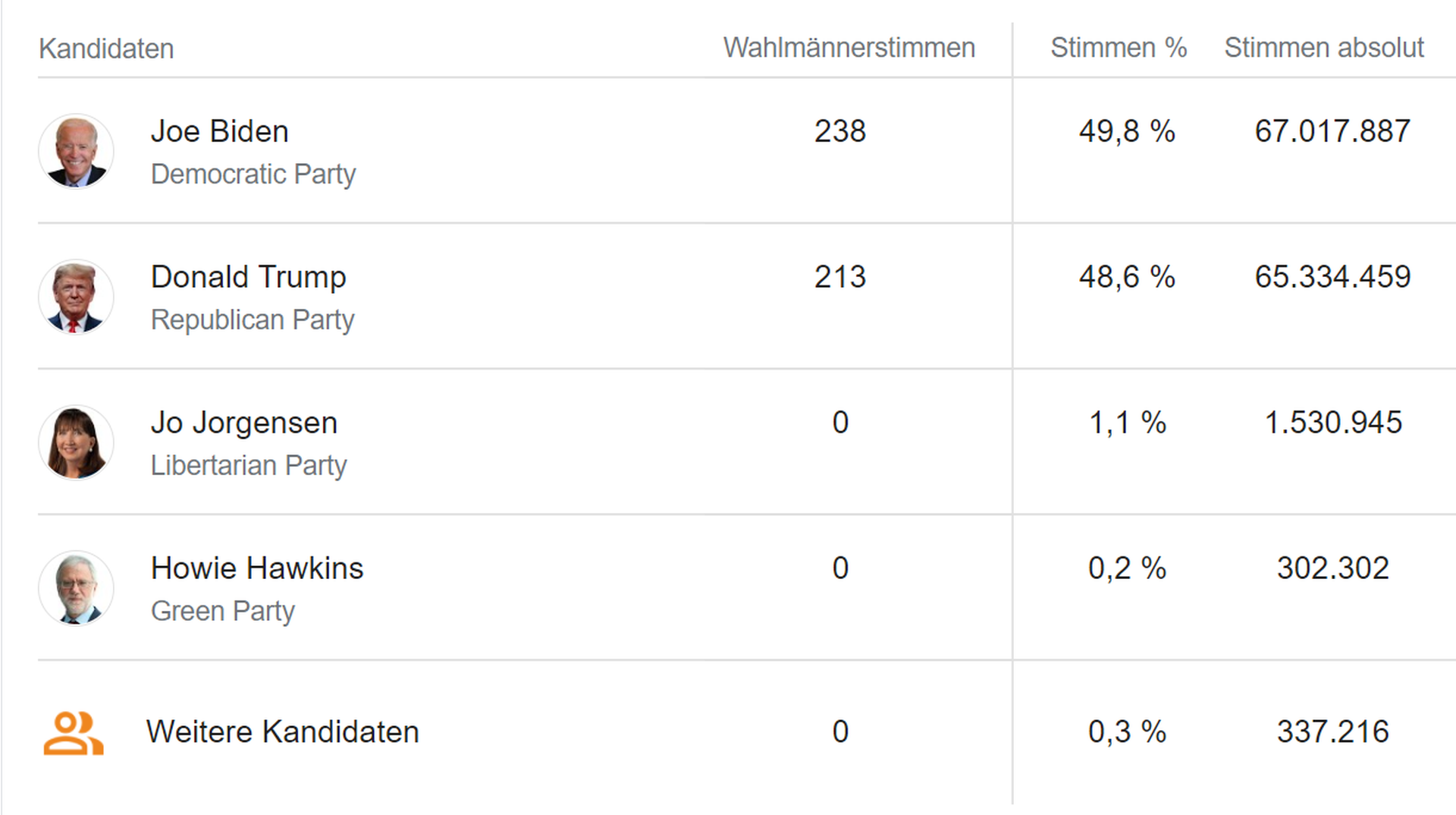 Um die Wahl zu gewinnen, brauchen ein Kandidat plus sein potentieller Vizepräsident also mehr als die Hälfte der 538, sprich mindestens 270 Wahlmännerstimmen. Und so sieht es am Mittwochmorgen zwischen 09:00 und 10:00 Uhr MEZ aus.