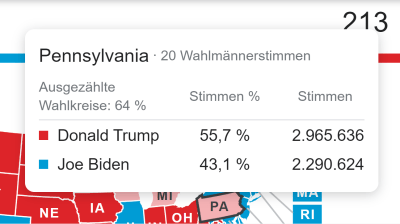 - Pennsylvania (20): Trump deutlich vorne (64% der Wahlkreise ausgezählt)