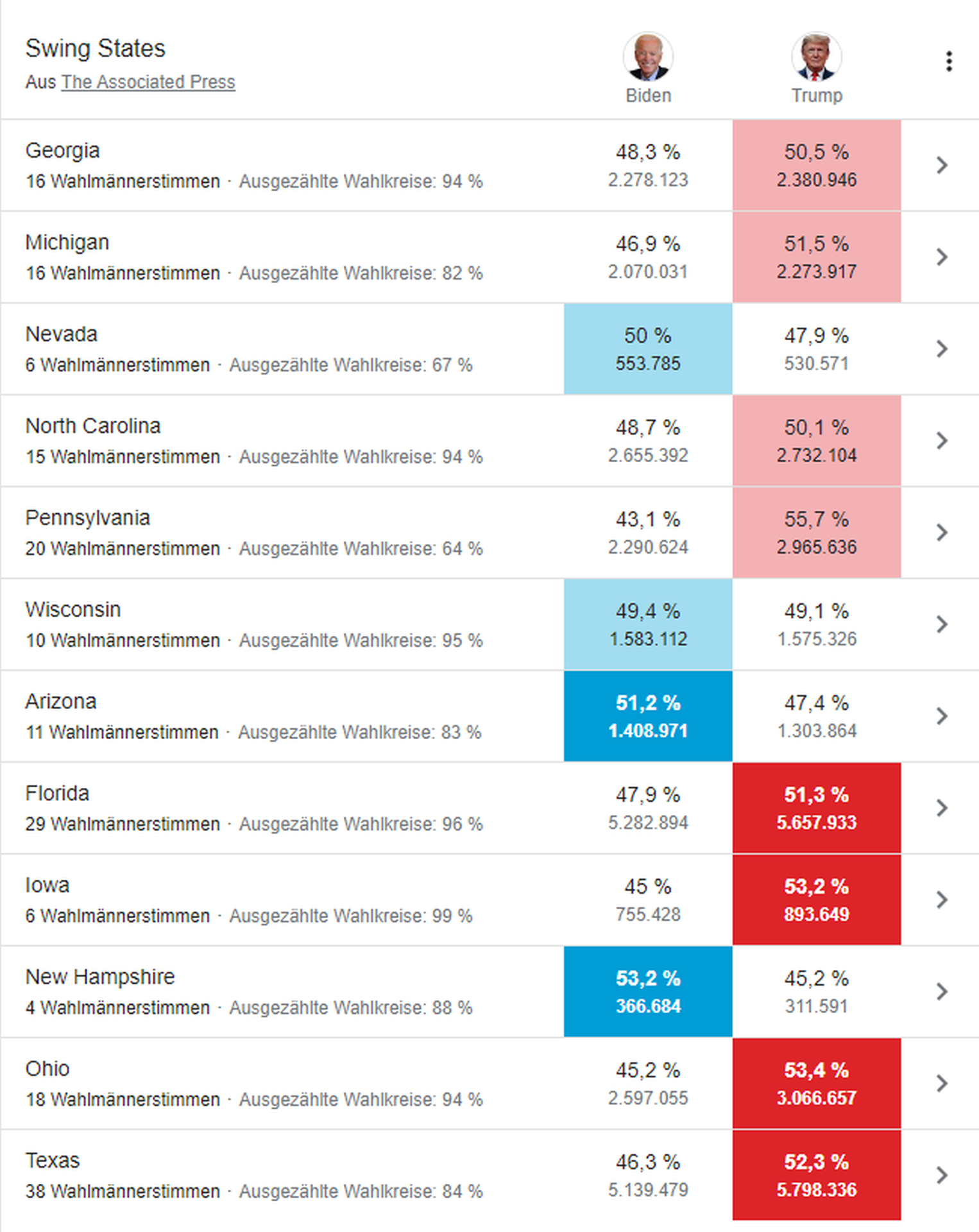 - Georgia (16): Trump ganz knapp vorne (94% der Wahlkreise ausgezählt)