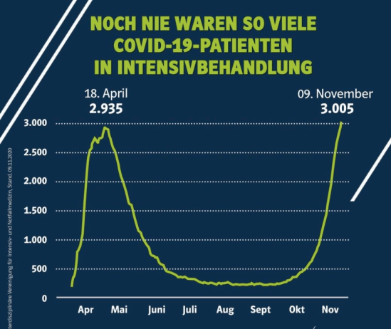 Bereits am Montag, den 09.11.2020, wurde laut der Deutschen Interdisziplinären Vereinigung für Intensiv- und Notfallmedizin bei den COVID-19-Patienten in Intensivbehandlung ein neuer Höchstwert erreicht. Erstmals stieg diese Zahl auf über 3.000, nämlich auf 3.005, siehe Grafik. Am Dienstag stieg sie weiter auf 3.059 (+54) und heute, am Mittwoch, auf 3.127 (+68).