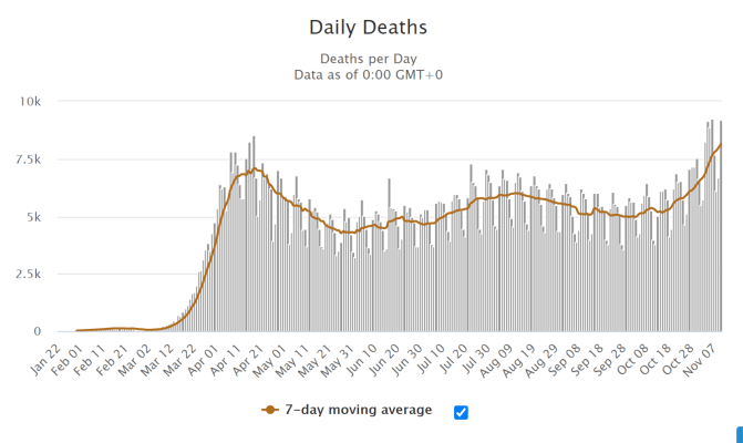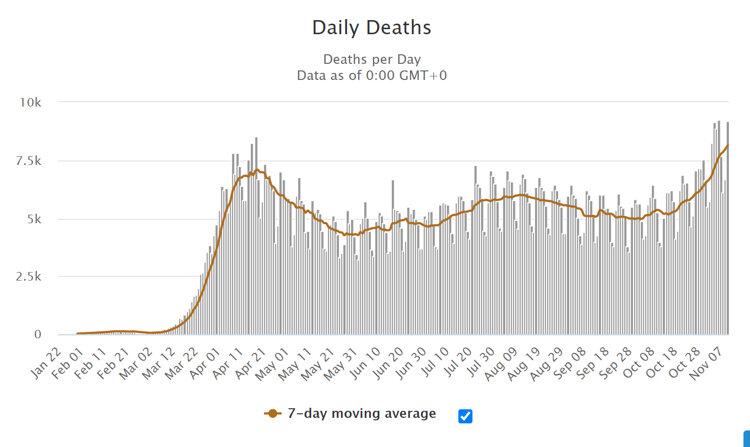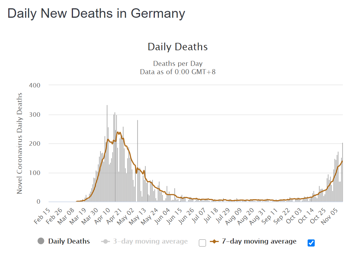 Wenn die Zahl der Infektionen der Älteren und folglich die Zahl der COVID-19-Patienten in Intensivbehandlung so drastisch ansteigen, dann steigen mit Zeitverzögerung auch die Todesfälle drastisch an. Gestern wurden erstmals seit Anfang Mai mehr als 200 Todesfälle in 24 Stunden registriert, siehe auch das Titelbild. Im Sieben-Tages-Mittel sind es zum Stand gestern laut Worldometer 139 pro Tag, also 7 x 139 = 973 Todesfälle in den letzten sieben Tagen.