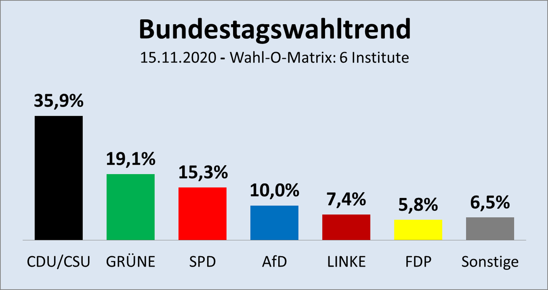 - INSA, mittlerer Tag der Befragung: 07./08.11.2020, internetbasierte Befragung von 2.030 nach Quotenvorgaben ausgewählten Mitgliedern eines Befragten-Pools