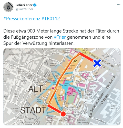„Diese etwa 900 Meter lange Strecke hat der Täter durch die Fußgängerzone von Trier genommen und eine Spur der Verwüstung hinterlassen.“
