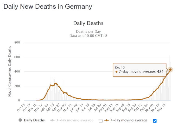 Laut Worldometer sogar 424 pro Tag im Schnitt (ca. 2.970 im Wochenschnitt). Tendenz steigend. Rechnet man die Todesfalldunkelziffer mit, dann wahrscheinlich sogar etwas mehr.