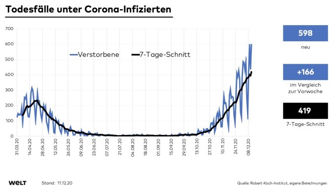 Über 2.930 Menschen starben laut RKI in Deutschland den letzten 7 Tagen nicht „mit“, sondern an COVID-19; 419 pro Tag im Wochen-Schnitt.