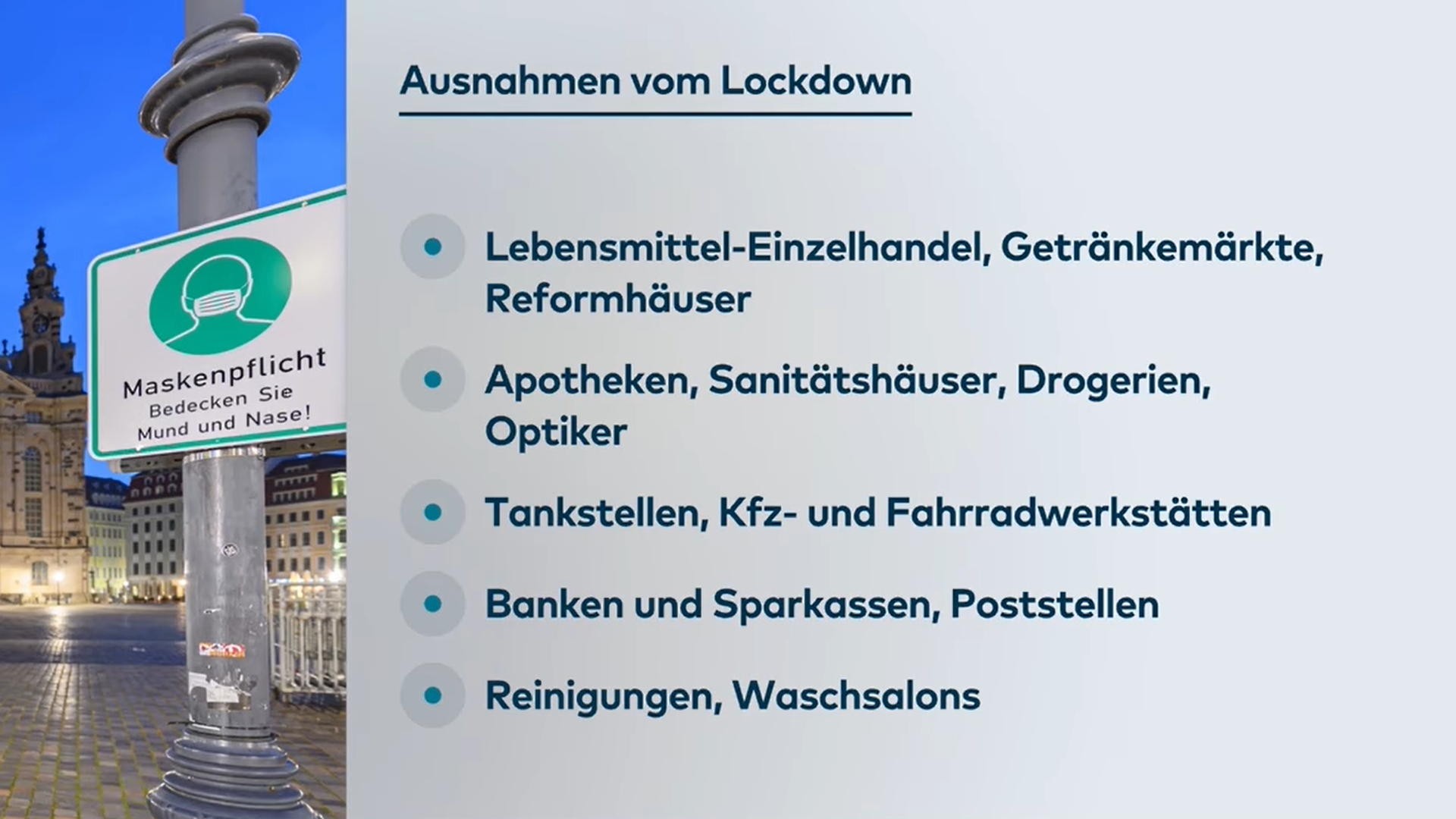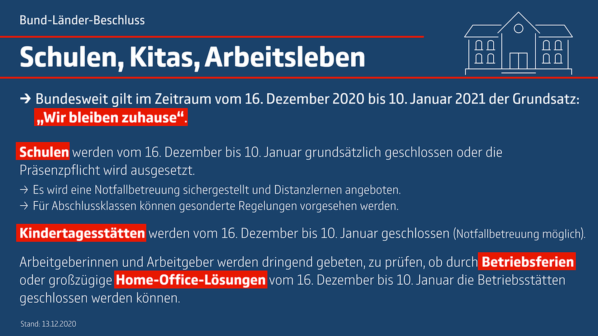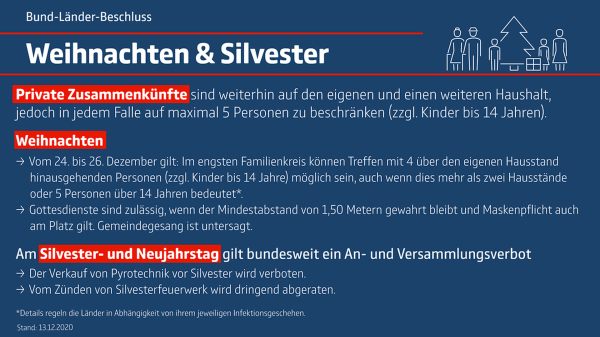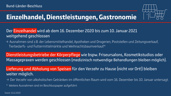 JFB hatte auf diese negative Entwicklung mehrfach hingewiesen, siehe insbesondere hier: Warum der Lockdown-light nur halb wirkt und hier: Es drohen über 46.000 weitere COVID-19-Tote bis Ende März. Das Vorhaben sei immer gewesen, eine Überlastung des Gesundheitssystems zu vermeiden, so die Kanzlerin. Die nun beschlossene Verschärfung der Maßnahmen habe Auswirkungen auf die Feiertage.