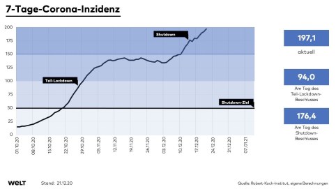 Dementsprechend sieht die Sieben-Tage-Inzidenz (registrierte Neuinfektionen pro 100.000 Einwohner in den letzten sieben Tagen) aus. Diese fällt nicht unter 50, besser unter 25, wo sie sein sollte, sondern sie steigt weiter auf jetzt fast 200: