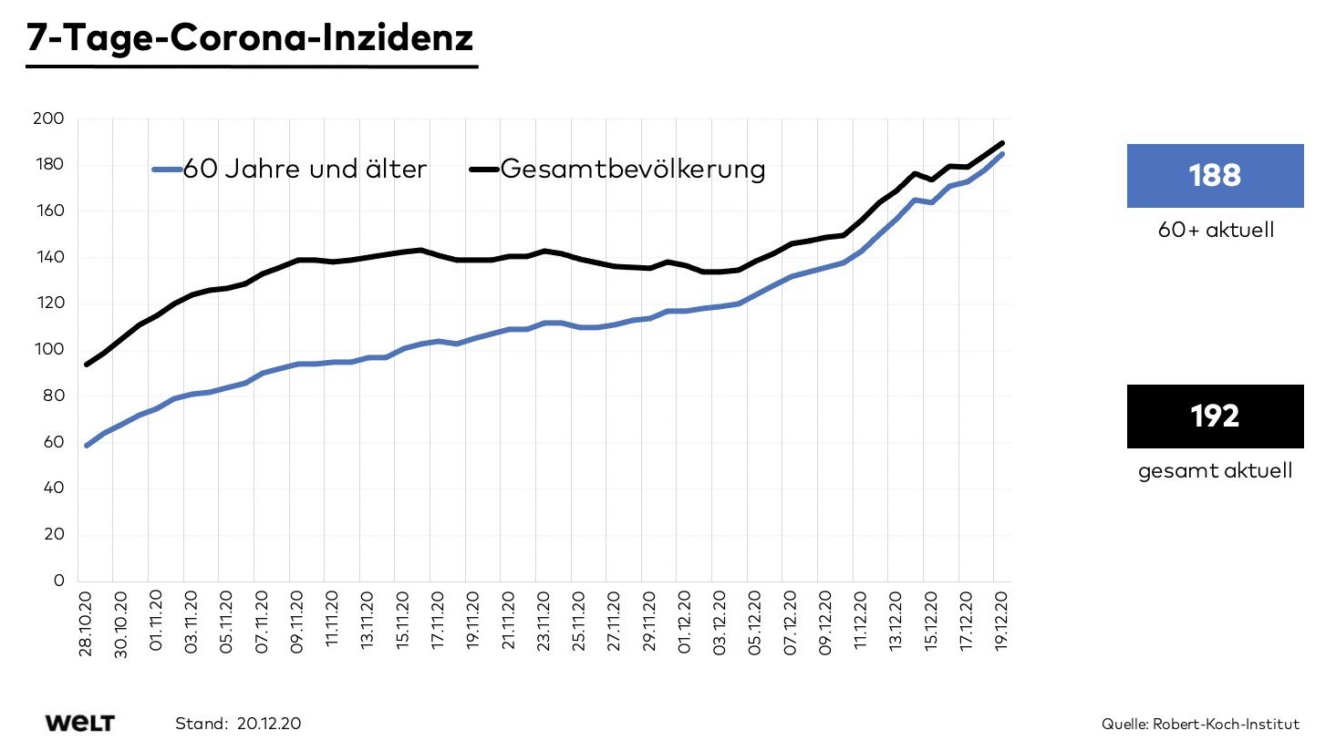 Ende Oktober war die Sieben-Tage-Inzidenz (Neuinfektionen pro 100.000 Einwohner in den letzten sieben Tagen) in der Gesamtbevölkerung (schwarze Linie) noch mehr als 1,5 so hoch wie bei den Ü60ern (blaue Linie). Inzwischen sind die beiden Inzidenzen mit 192 und 188 aber fast gleich hoch. Dies bestätigt eher meine These, dass das Virus früher oder später auf die Alten und auf die anderen vulnerablen Gruppen überspringt, wenn es sich erstmal zahlreich ausgebreitet hat in der Gesamtbevölkerung. Und wie sollte man zig Millionen Menschen dann dauerhaft isolieren? Ich halte das für ein Ablenkungsmanöver und eine Verdrängungsphänomen, weil einige die eigentliche Problematik und deren Ernsthaftigkeit nicht wahrhaben wollen.
