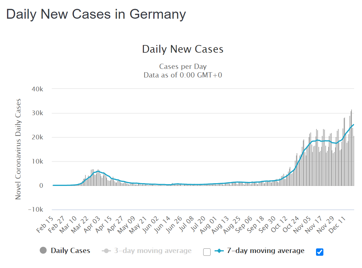 Im Sieben-Tage-Mittel (die braune Linie in der Grafik unten) steigt die Zahl der COVID-19-Todesfälle laut Worldometer, das meist noch etwas genauere und aktuellere Zahlen hat als das RKI, jetzt sogar auf 622 pro Tag. Das ist mehr als zweieinhalb mal so viel wie in der schlimmsten Woche in der ersten Coronawelle Mitte April (239 pro Tag, 1.673 in der schlimmsten Woche).