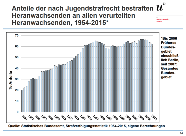 Zugleich wurde die strafrechtliche Heranwachsenden-Regelung nun immer häufiger zugunsten der 18- bis Unter-21-Jährigen Straftäter ausgelegt. Aus der Ausnahme-Regelung wegen einer vereinzelten Reifeverzögerung wurde der Regelfall. In dieser Grafik aus einer Ausarbeitung von Ineke Pruin, Institut für Strafrecht und Kriminologie, Universität Bern, sieht man, wie sich in Deutschland der Anteil der 18- bis Unter-21-Jährigen seit 1954 verändert hat, die trotz ihrer Volljährigkeit und trotz ihrer Wahlberechtigung, sobald sie Straftaten, insbesondere Verbrechen begehen, dann plötzlich von den Gerichten doch nur als Jugendliche angesehen werden: