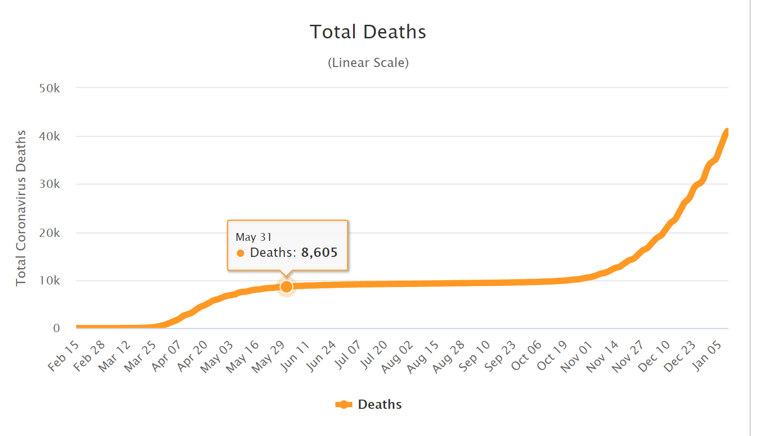 Inzwischen sind wir zum Stand gestern, 09.01.2021, bei etwa 41.000 Todesfällen in Deutschland infolge der Infektion mit SARS-CoV-2. Wir erinnern uns: Ende Mai waren es gerade 8.600. Jetzt sind wir schon fast bei dem fünffachen Wert davon. Die zweite Welle ist schon jetzt fast viermal so verheerend wie die erste und ein Ende ist noch lange nicht in Sicht.