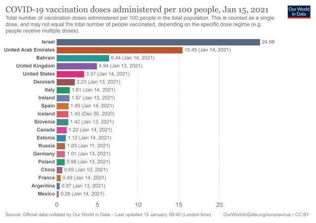 Während in Israel bereits ein Viertel der Bevölkerung (25 Prozent) geimpft sind, in den Vereinigten Arabischen Emiraten 15 bis 16 Prozent, so sind es in Deutschland am 13.01.2021 gerade mal 1,01 Prozent.