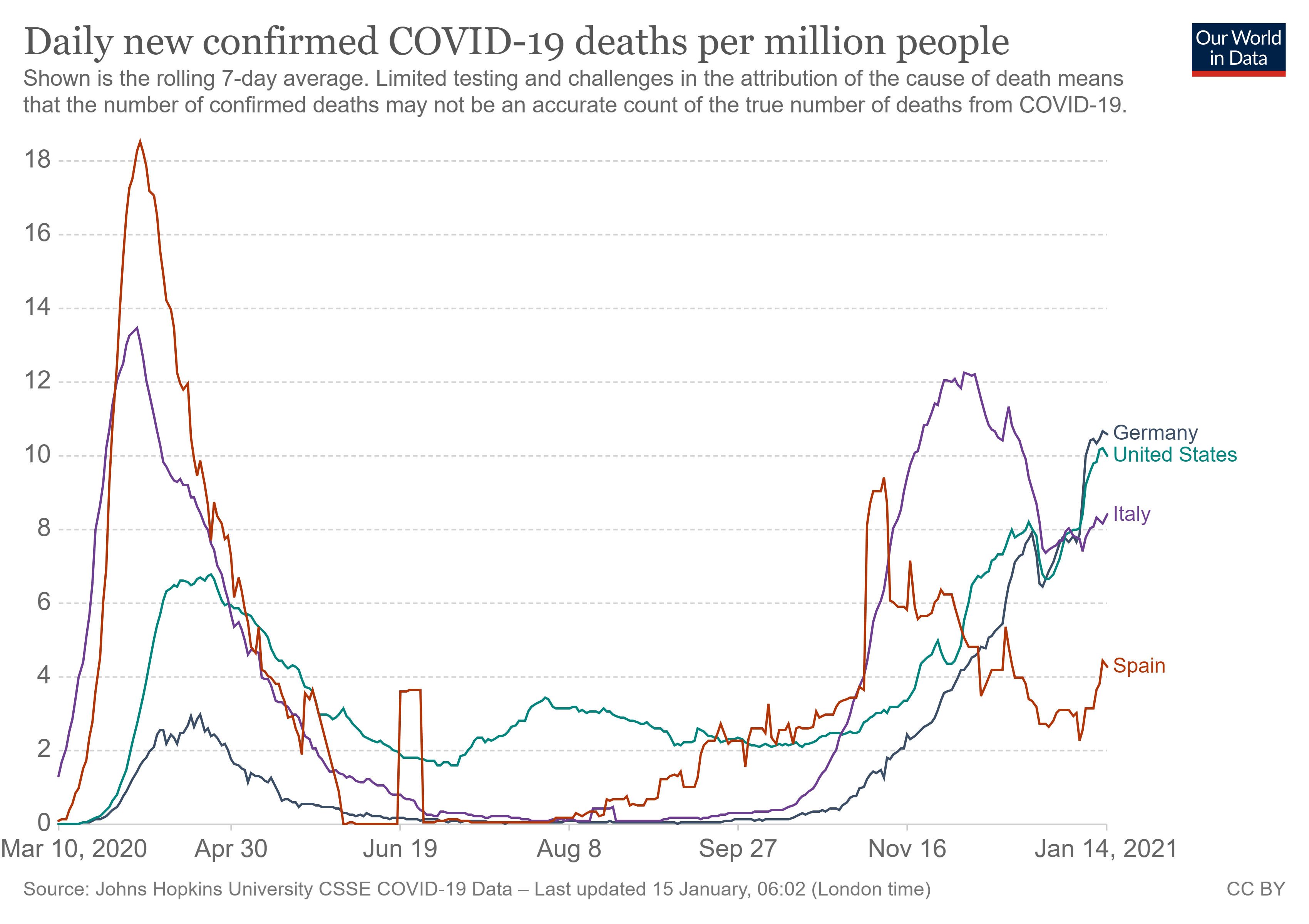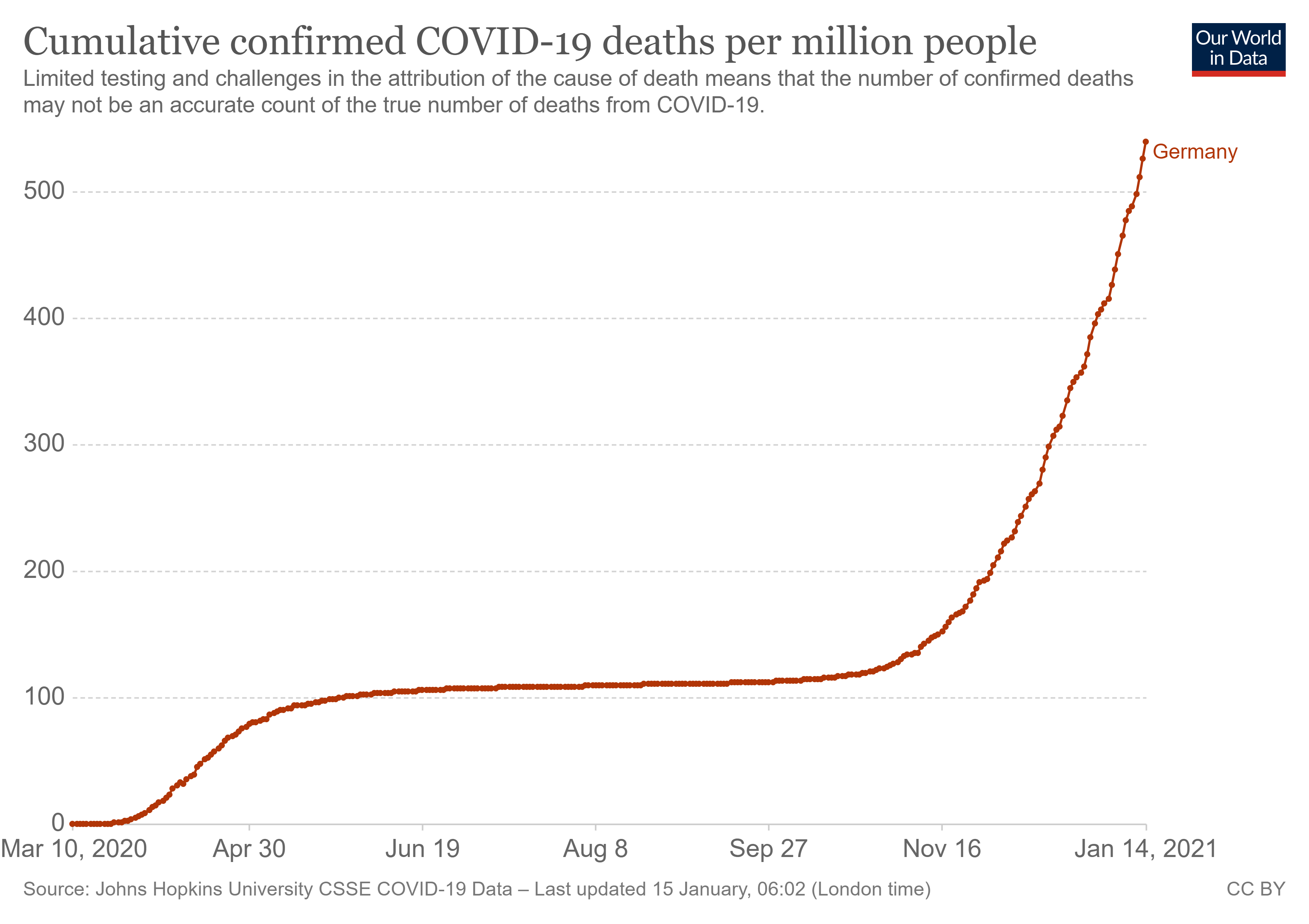 Mehr als zwei Millionen Menschen sind infolge der Infektion mit SARS-CoV-2 bereits gestorben, 398.000 in den USA, 207.000 in Brasilien. Deutschland hat sich mit 45.000 Corona-Toten weltweit inzwischen auf Platz 12 vorgeschoben. Schlimmer noch: Im Sterben an COVID-19 hat Deutschland pro Einwohner aktuell Spanien, Italien und die USA überholt. In der Impfquote aber liegen all diese Länder vor Deutschland.