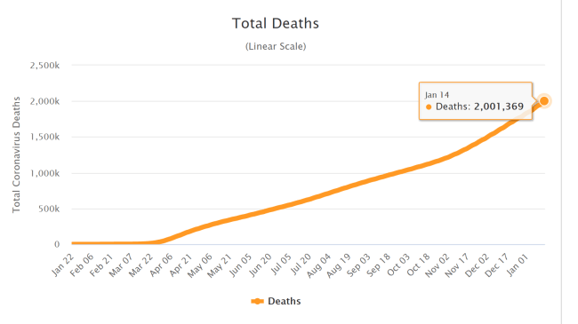 Laut Worldometer stieg die Zahl der Corona-Toten gestern, am 14. Januar 2021, auf über 2 Millionen. Und das in weniger als einem Jahr. Die Übersterblichkeit dürfte – bedingt durch eine Todesfalldunkelziffer und Kollateralschäden – nochmals rund eine halbe Million, also etwa 25 Prozent höher liegen.