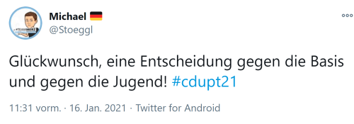 Ob dieser ganze Vorgang, wie Laschet in der Stichwahl von knapp tausend CDU-Delegierten mit knapper Mehrheit von 52,8 zu 47,2 Prozent gegen Merz zum neuen CDU-Vorsitzenden gewählt wurde, vollkommen entgegen sämtlicher Umfragen unter Unionswählern seit Februar 2020 bis Januar 2021, vollkommen entgegen dem Votum aller CDU-Kreisverbände, wirklich dazu angetan ist, das Vertrauen in diese Wahl, das Vertrauen in diese Person und das Vertrauen in diese Partei zu erhöhen, darüber möge sich jeder selbst ein Urteil bilden. Für viele bleibt ein bitterer Beigeschmack. Ein sehr bitterer.
