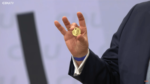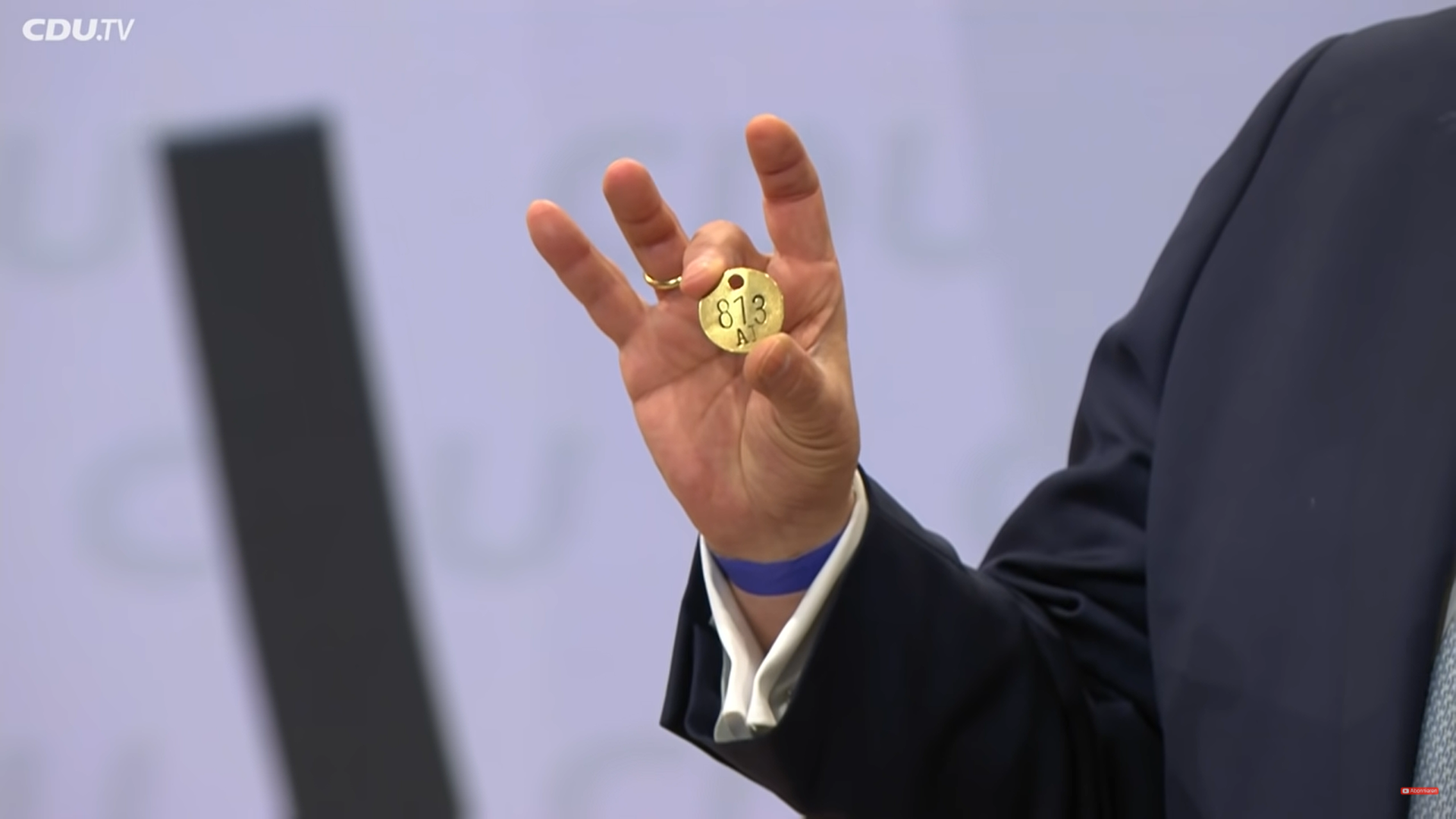 - Dann geht Laschet um das Pult herum und kommt nach vorne (Inszenierung?), zückt die Erkennungsmarke seines Vaters, den Bergarbeiters, als Glücksbringer und streckt sie in die Kamera (Inszenierung?). Gehen Sie bitte davon aus, dass hier jede Geste, jede Bewegung genau einstudiert war, auch die medienwirksamen Bilder, die hier erzeugt, wahrscheinlich vor dem Spiegel genau einstudiert wurden und dann über die M-Medien verbreitet werden.