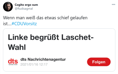 Und vor allem die M-Medien wollten zusammen mit den Grünen und der SPD Laschet. Röttgen wäre wohl auch gegangen, aber Merz wollten alle diese Gruppen zusammen verhindern. Und das haben sie alle zusammen mit vereinten Kräften geschafft. Wobei all diese Kräfte zusammen Laschet gerade mal auf 52,8 Prozent der Delegiertenstimmen brachten und Merz gegen diesen Gegenwind von Merkel, gegen die Mehrheit des CDU-Führungskreises, gegen die Grünen, gegen die SPD, gegen die M-Medien es immerhin auf 47,2 Prozent der Stimmen der Delegierten brachte.