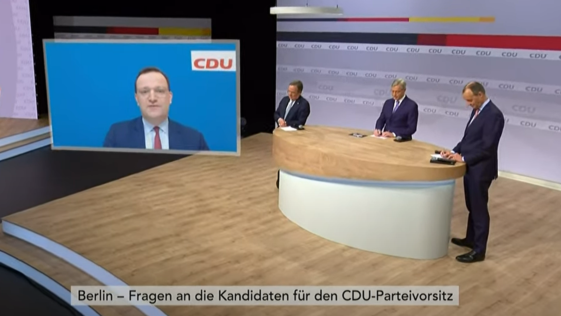Anschließend schaltete man nochmals Herrn Adams zu, den man auch sehen, aber nicht hören könnte. So wurde also die „Fragerunde“ beendet, nachdem exakt zwei Fragen gestellt worden waren, eine an alle drei Kandidaten und eine kritische speziell an Friedrich Merz, plus eine 83-sekündige zusätzliche Werberede für Armin Laschet von niemand Geringerem als seinem eigenen Vize im „Team Laschet“, den Bundesgesundheitsminister (Regierungsmitglied) Jens Spahn.