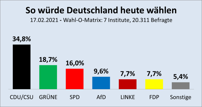 - Civey (SPIEGEL), mittlerer Tag der Befragung: 12./13.02.2021, netzwerkbasierte Panel-Rekrutierung + Teilnehmerverifizierung + quotierte Stichprobe unverzerrter Antworten + Echtzeitgewichtung, Stichprobe: 10.075 Befragte