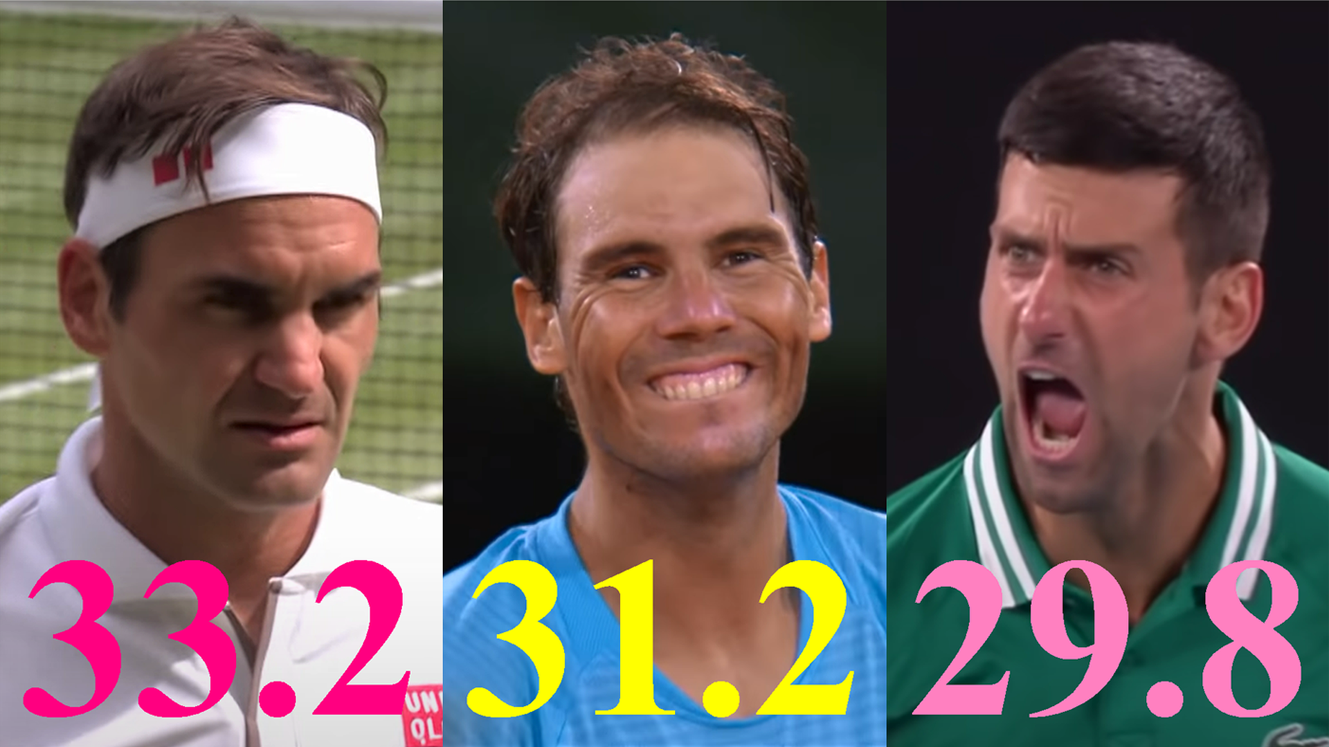 - Roger Federer: (20 + 0.5) + 3 + 0.2 + 0.3 + 9.2 = 33.2