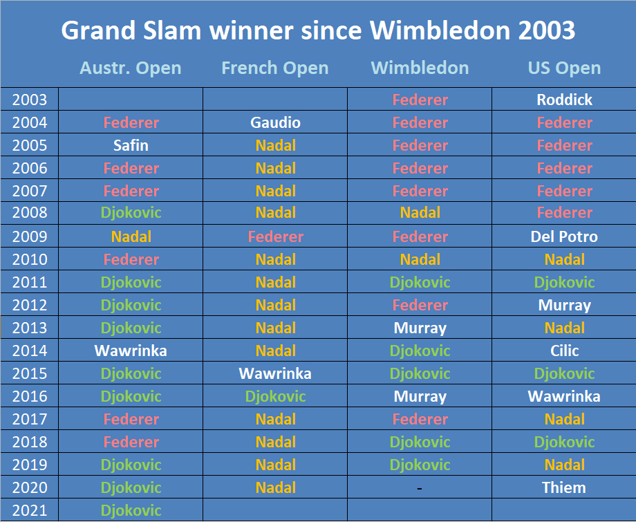 These successes are by far the most important factor for the great tennis players, who are measured by no other criterion as much as their successes in these four A tournaments. Since Wimbledon 2003, three players have completely dominated world tennis here, winning 58 of the last 70 Grand Slam tournaments (83 per cent): Federer, Nadal and Djokovic.