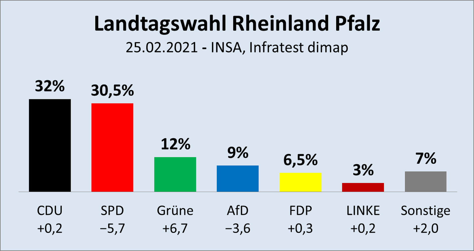 Nun wurden diese Woche zwei Umfragen von INSA für die BILD und Infratest dimap für den SWR veröffentlicht, die beide zu dem Ergebnis kommen, dass die SPD hinter der CDU liegt.