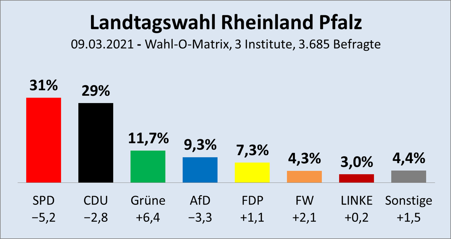 Seit Juni 2018 lag die CDU in sämtlichen Umfragen in Rheinland-Pfalz vor der SPD mit ihrer Ministerpräsidentin Malu Dreyer. Doch wenige Tage vor der Landtagswahl fällt die CDU nun hinter diese zurück, obschon die SPD mit deutlichen Verlusten rechnen muss. Ihre Verluste scheinen die mitregierenden Grünen aber mehr als kompensieren zu können, die ihr 2016er Ergebnis mehr als verdoppeln dürften, während die AfD mehr als ein Viertel ihrer Wähler zu verlieren droht.